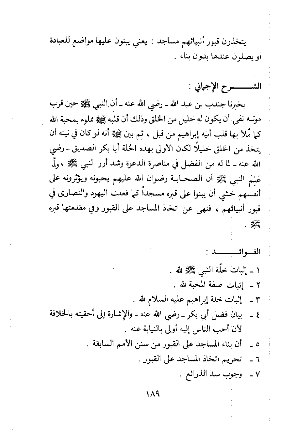 يخبرنا جندب بن عبد الله رضي الله عنه أن النبي صلى الله عليه وسلم حين قرب موته نفى أن يكون له خليل من الخلق، وذلك أن قلبه صلى الله عليه وسلم مملوء بمحبة الله كما ملئ بها قلب أبيه إبراهيم من قبل، ثم بين صلى الله عليه وسلم أنه لو كان في نيته أن يتخذ من الخلق خليلا لكان الأولى بهذه الخلة أبا بكر الصديق رضي الله عنه؛ لما له من الفضل في مناصرة الدعوة وشد أزر النبي صلى الله عليه وسلم، ولما علم النبي صلى الله عليه وسلم أن الصحابة -رضوان الله عليهم- يحبونه ويؤثرونه على أنفسهم خشي أن يبنوا على قبره مسجدا كما فعلت اليهود والنصارى في قبور أنبيائهم، فنهى عن اتخاذ المساجد على القبور وفي مقدمتها قبره صلى الله عليه وسلم.