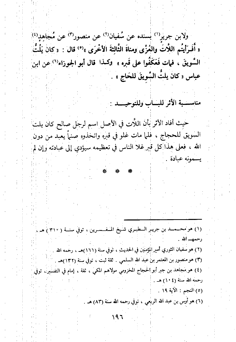 ولابن جرير1 بسنده عن سفيان2 عن منصور3 عن مجاهد4 {أَفَرَأَيْتُمُ اللاَّتَ وَالْعُزَّى وَمَنَاةَ الثَّالِثَةَ الأُخْرَى} 5 قال: "كان يلت السويق، فمات فعكفوا على قبره". وكذا قال أبو الجوزاء6 عن ابن عباس: "كان يلت السويق للحاج".