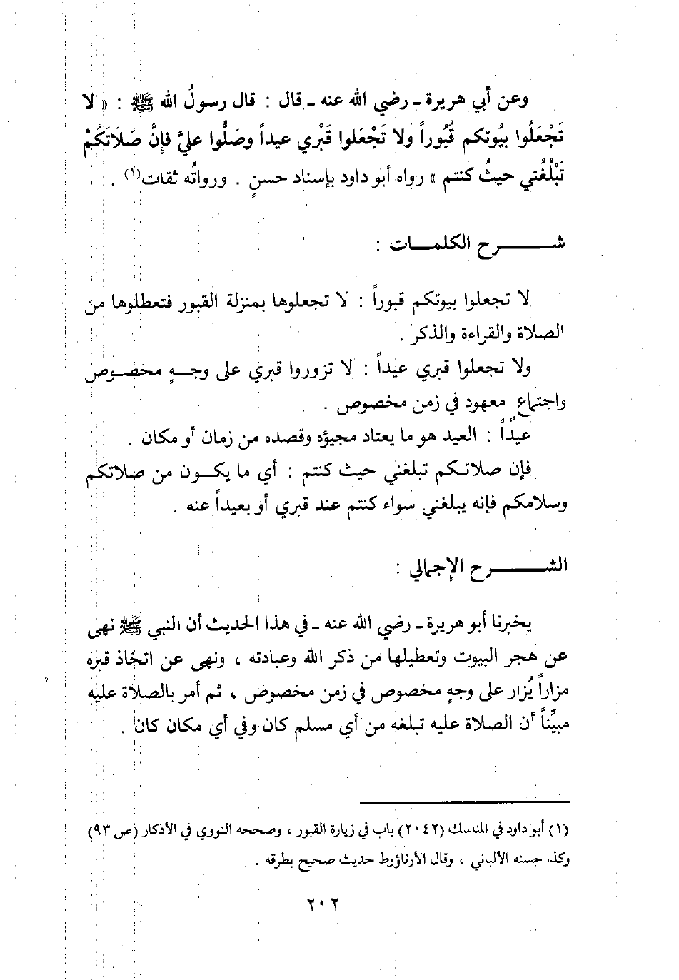 وعن أبي هريرة رضي الله عنه قال: قال رسول الله صلى الله عليه وسلم: "لا تجعلوا بيوتكم قبورا، ولا تجعلوا قبري عيدا، وصلوا علي فإن صلاتكم تبلغني حيث كنتم". رواه أبو داود بإسناد حسن. ورواته ثقات1.