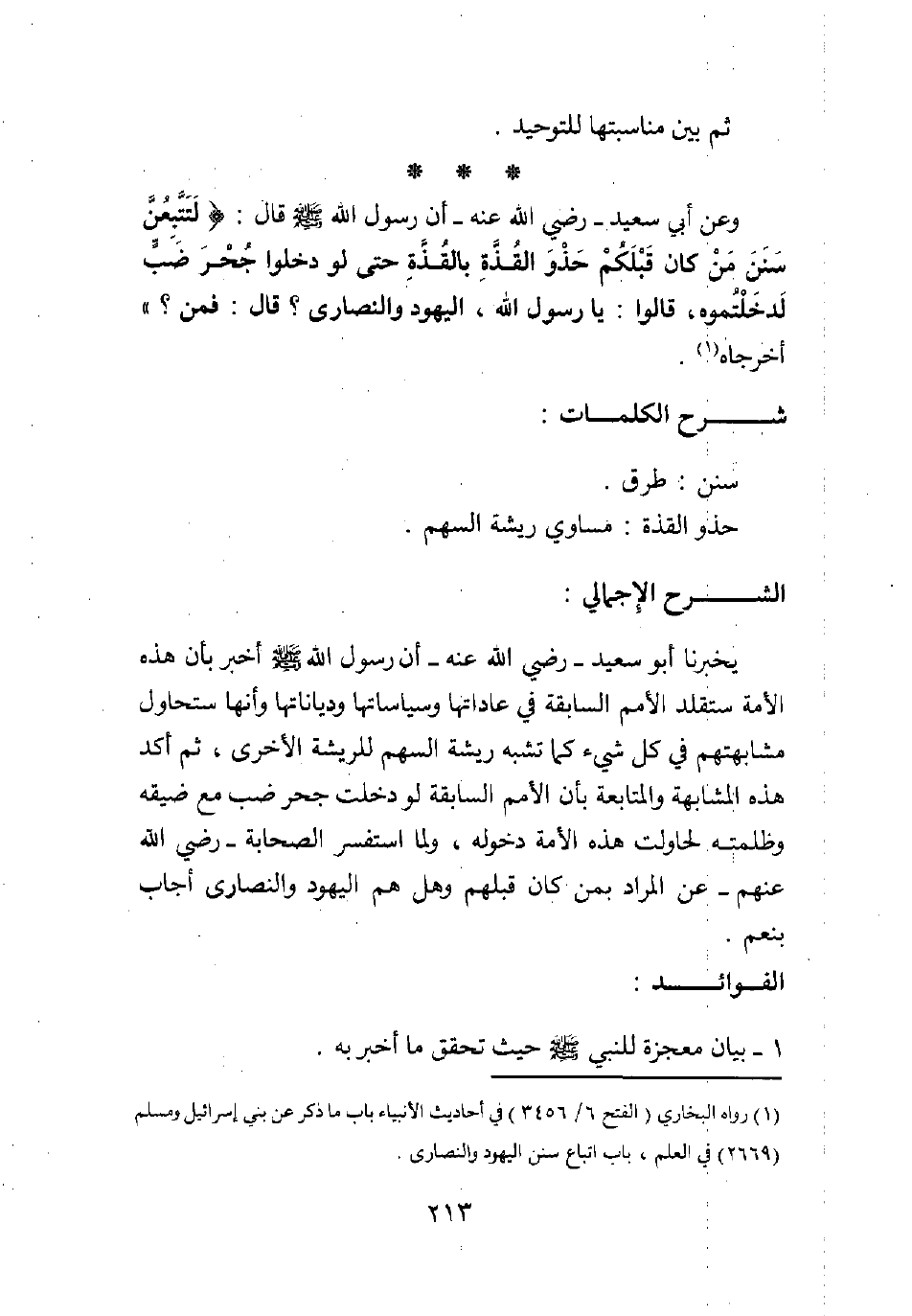 1 رواه البخاري (الفتح 6/ 3456) في أحاديث الأنبياء، باب ما ذكر عن بني إسرائيل. ومسلم (2669) في العلم, باب اتباع سنن اليهود والنصارى.