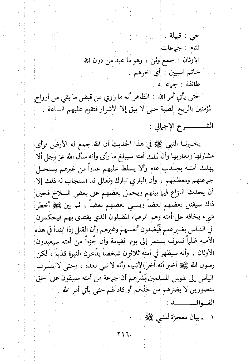 يخبرنا النبي صلى الله عليه وسلم في هذا الحديث أن الله جمع له الأرض فرأى مشارقها ومغاربها، وأن ملك أمته سيبلغ ما رأى، وأنه سأل الله عزوجل ألا يهلك أمته بجدب عام، وألا يسلط عليهم عدوا من غيرهم يستحل جماعتهم ومعظمهم، وأن الباري -تبارك وتعالى- قد استجاب له ذلك إلا أن يحدث النزاع فيما بينهم ويحمل بعضهم على بعض السلاح، فحين ذاك سيقتل بعضهم بعضا ويسبي بعضهم بعضا. ثم بين صلى الله عليه وسلم أخطر شيء يخافه على أمته وهم الزعماء المضلون الذي يقتدى بهم، فيحكمون في الناس بغير علم فيضلون أنفسهم وغيرهم، وأن القتل إذا ابتدأ في هذه الأمة ظلما فسوف يستمر إلى يوم القيامة، وأن جزءا من أمته سيعبدون الأوثان، وأنه سيظهر في أمته ثلاثون شخصا يدعون النبوة كذبا، لكن رسول الله صلى الله عليه وسلم أخبر أنه آخر الأنبياء وأنه لا نبي بعده، وحتى لا يتسرب اليأس إلى نفوس المسلمين بشرهم أن جماعة من أمته سيبقون على الحق منصورين لا يضرهم من خذلهم أو كاد لهم حتى يأتي أمر الله.