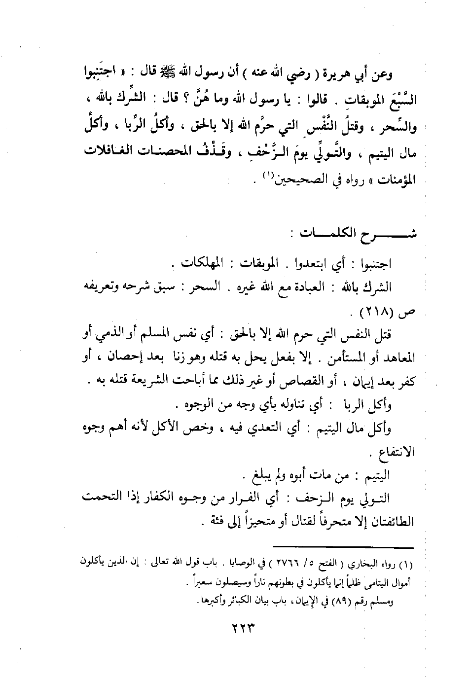 وعن أبي هريرة (رضي الله عنه) أن رسول الله صلى الله عليه وسلم قال: "اجتنبوا السبع الموبقات. قالوا: يا رسول الله وما هن؟ قال: الشرك بالله، والسحر، وقتل النفس التي حرم الله إلا بالحق، وأكل الربا، وأكل مال اليتيم، والتولي يوم الزحف، وقذف المحصنات الغافلات المؤمنات". رواه في الصحيحين1.