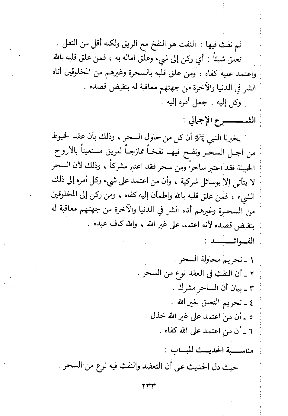 يخبرنا النبي صلى الله عليه وسلم أن كل من حاول السحر، وذلك بأن عقد الخيوط من أجل السحر ونفخ فيها نفخا ممازجا للريق مستعينا بالأرواح الخبيثة، فقد اعتبر ساحرا، ومن سحر فقد اعتبر مشركا؛ وذلك لأن السحر لا يتأتى إلا بوسائل شركية، وأن من اعتمد على شيء وكل أمره إلى ذلك الشيء، فمن علق قلبه بالله واطمأن إليه كفاه، ومن ركن إلى المخلوقين من السحرة وغيرهم أتاه الشر في الدنيا والآخرة من جهتهم معاقبة له بنقيض قصده؛ لأنه اعتمد على غير الله، والله كاف عبده.