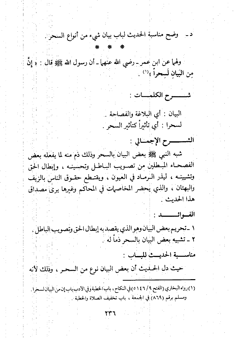 شبه النبي صلى الله عليه وسلم بعض البيان بالسحر، وذلك ذم منه لما يفعله بعض الفصحاء المبطلين من تصويب الباطل وتحسينه، وإبطال الحق وتشيينه، ليذر الرماد في العيون، ويقتطع حقوق الناس بالزيف والبهتان، والذي يحضر المخاصمات في المحاكم وغيرها يرى مصداق هذا الحديث.