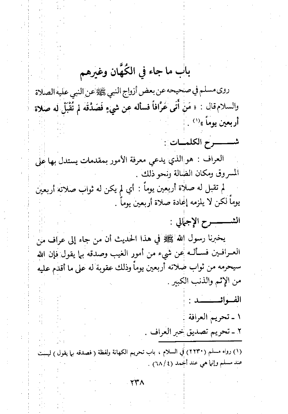 1 رواه مسلم (2230) في السلام, باب تحريم الكهانة: ولفظة: "فصدقه بما يقول" ليست عند مسلم، وإنما هي عند أحمد (4/ 68) .
