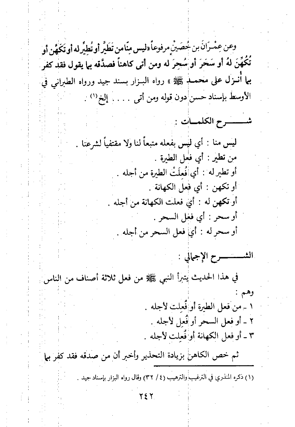 وعن عمران بن حصين مرفوعا: "ليس منا من تطير أو تطير له، أو تكهن أو تكهن له، أو سحر أو سحر له، ومن أتى كاهنا فصدقه بما يقول، فقد كفر بما أنزل على محمد صلى الله عليه وسلم". رواه البزار بسند جيد، ورواه الطبراني في الأوسط بإسناد حسن دون قوله: " ومن أتى.... " إلخ1.
