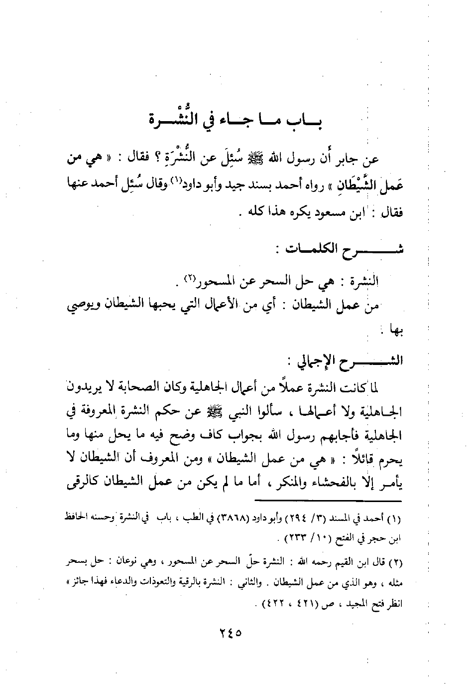 عن جابر " أن رسول الله صلى الله عليه وسلم سئل عن النشرة؟ فقال: هي من عمل الشيطان ". رواه أحمد بسند جيد، وأبو داود1. وقال سئل أحمد عنها؟ فقال: ((ابن مسعود يكره هذا كله)) .