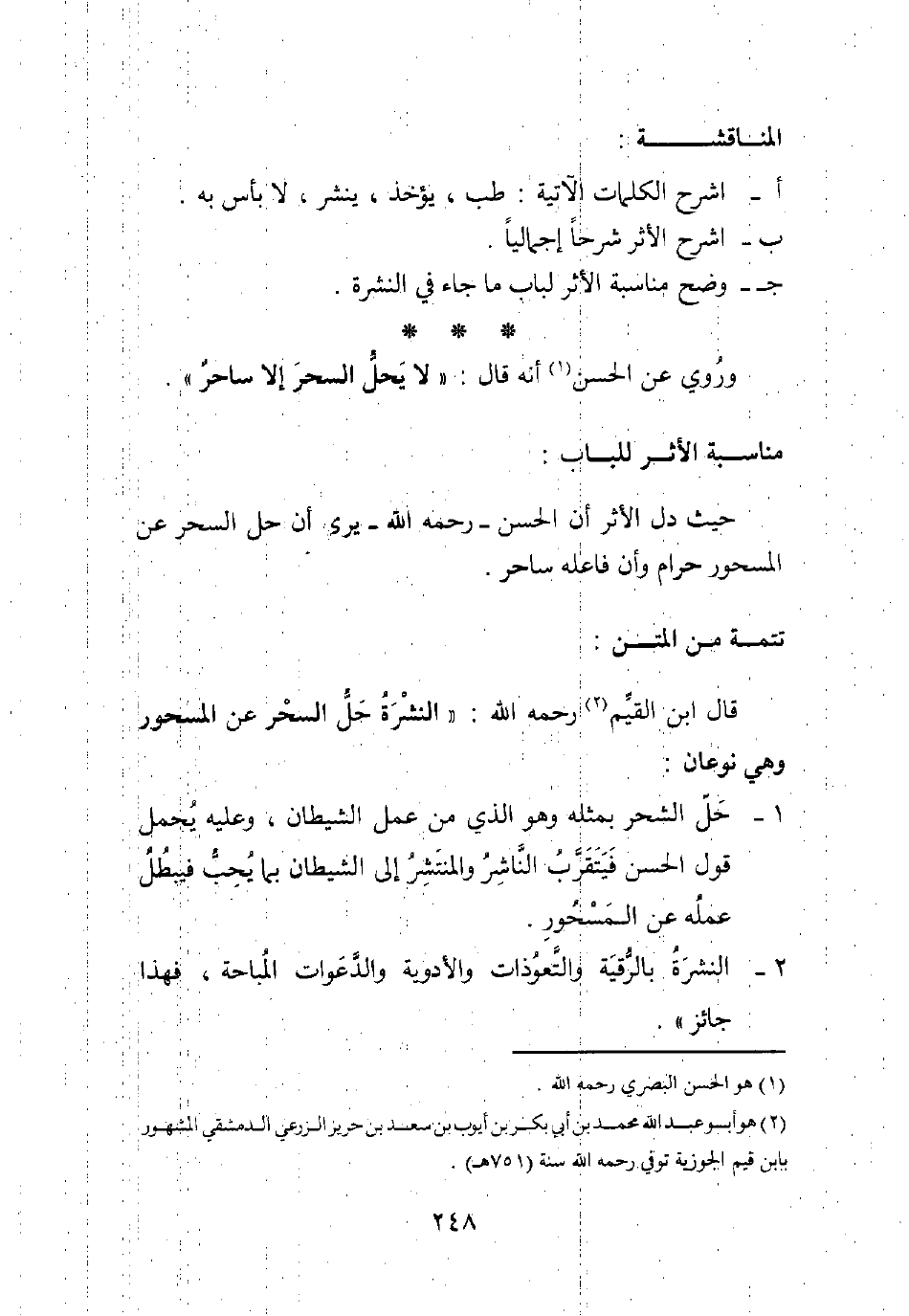 حيث دل الأثر أن الحسن - رحمه الله - يرى أن حل السحر عن المسحور حرام، وأن فاعله ساحر.