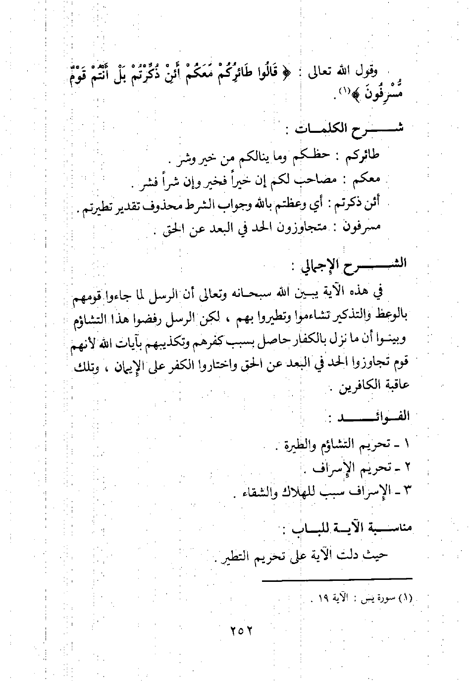 وقول الله تعالى: {قَالُوا طَائِرُكُمْ مَعَكُمْ أَإِنْ ذُكِّرْتُمْ بَلْ أَنْتُمْ قَوْمٌ مُسْرِفُونَ} 1.
