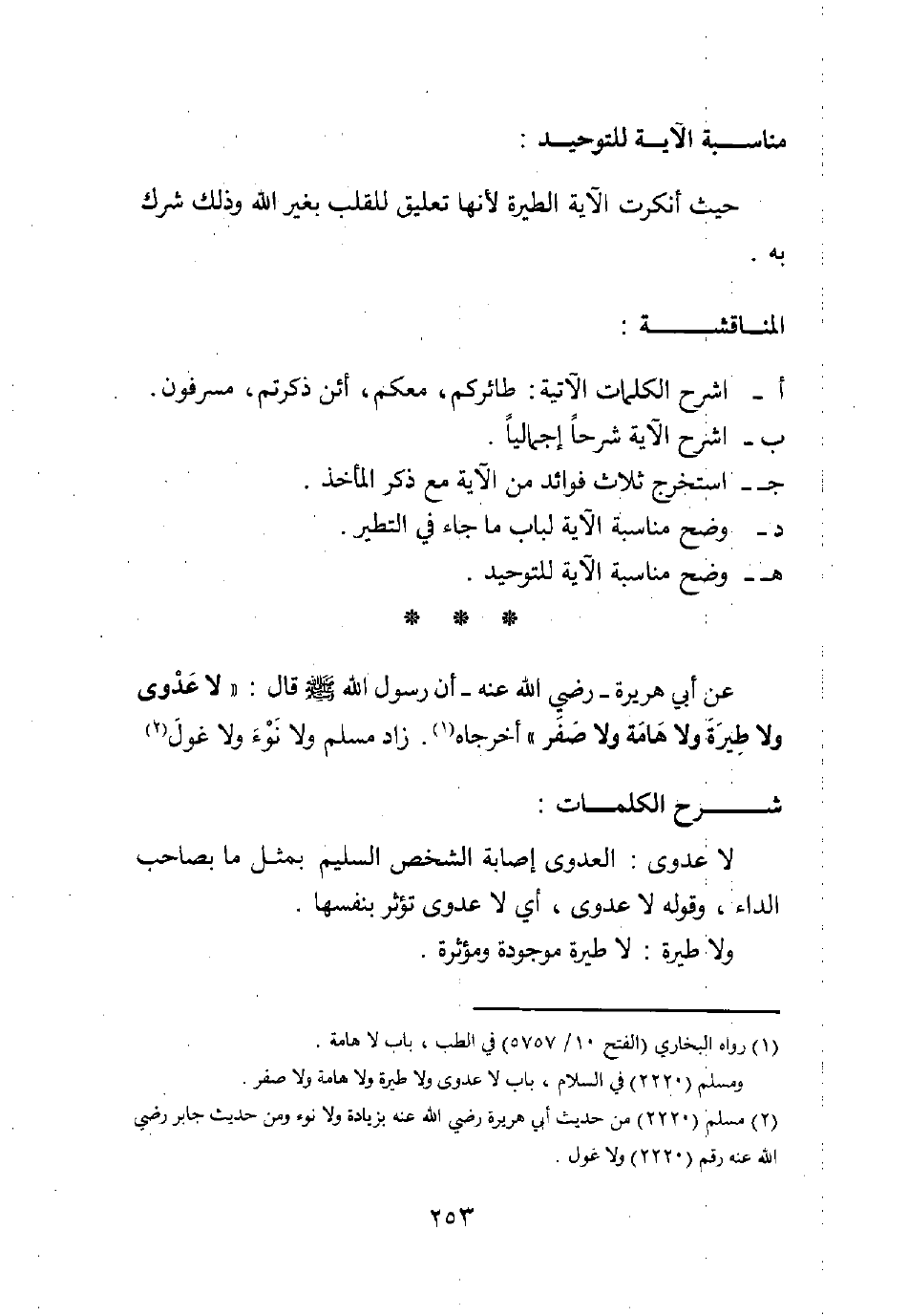 2 مسلم (2220) من حديث أبي هريرة -رضي الله عنه- بزيادة: "ولا نوء "، ومن حديث جابر -رضي الله عنه- رقم (2220) : "ولا غول ".