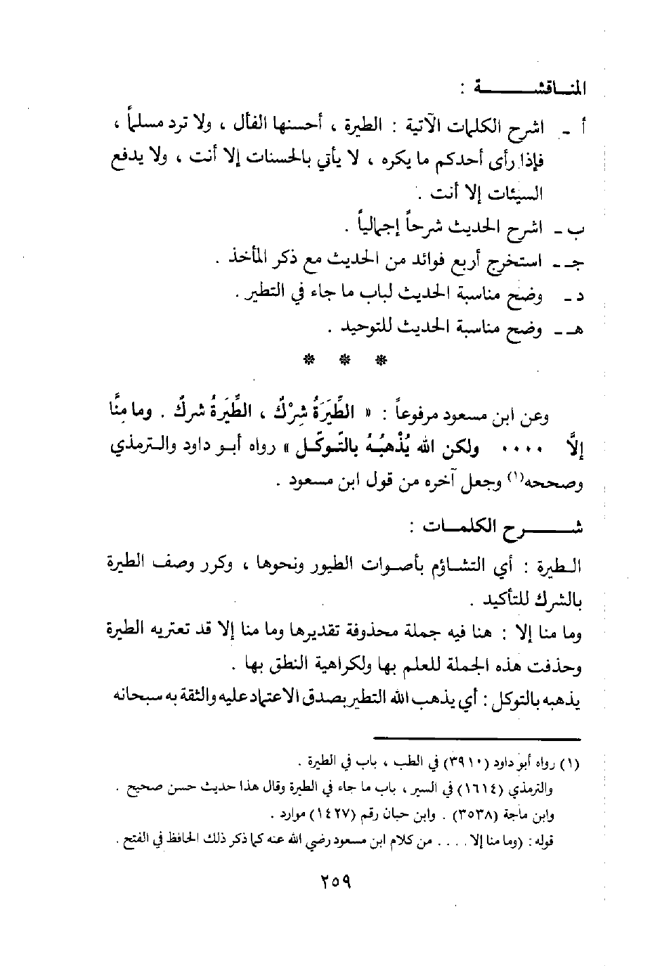 1 أبو داود (3910) في الطب, باب في الطيرة. والترمذي (1614) في السير, باب ما جاء في الطيرة. وقال: ((هذا حديث حسن صحيح)) . وابن ماجة (3538) . وابن حبان رقم (1427) موارد. قوله: (وما منا إلا ... ) من كلام ابن مسعود -رضي الله عنه- كما ذكر ذلك الحافظ في الفتح.