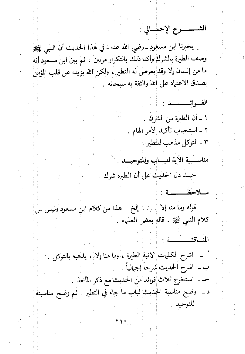 يخبرنا ابن مسعود رضي الله عنه في هذا الحديث أن النبي صلى الله عليه وسلم وصف الطيرة بالشرك، وأكد ذلك بالتكرار مرتين، ثم بين ابن مسعود أنه ما من إنسان إلا وقد يعرض له التطير، ولكن الله يزيله عن قلب المؤمن بصدق الاعتماد على الله والثقة به سبحانه.