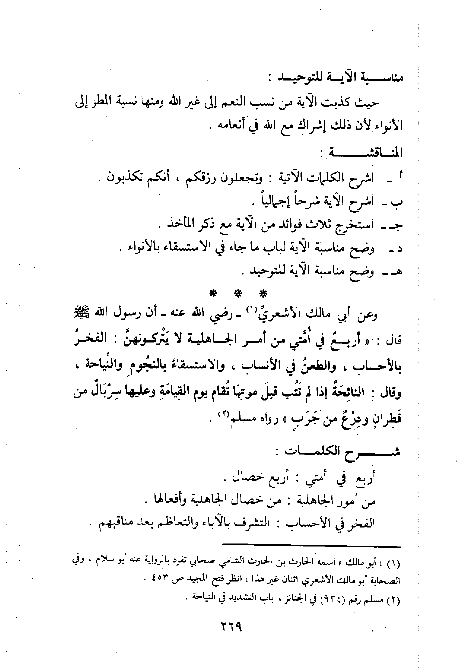 1 "أبو مالك" اسمه الحارث بن الحارث الشامي صحابي، تفرد بالرواية عنه أبو سلام, وفي الصحابة أبو مالك الأشعري اثنان غير هذا. انظر فتح المجيد ص453.