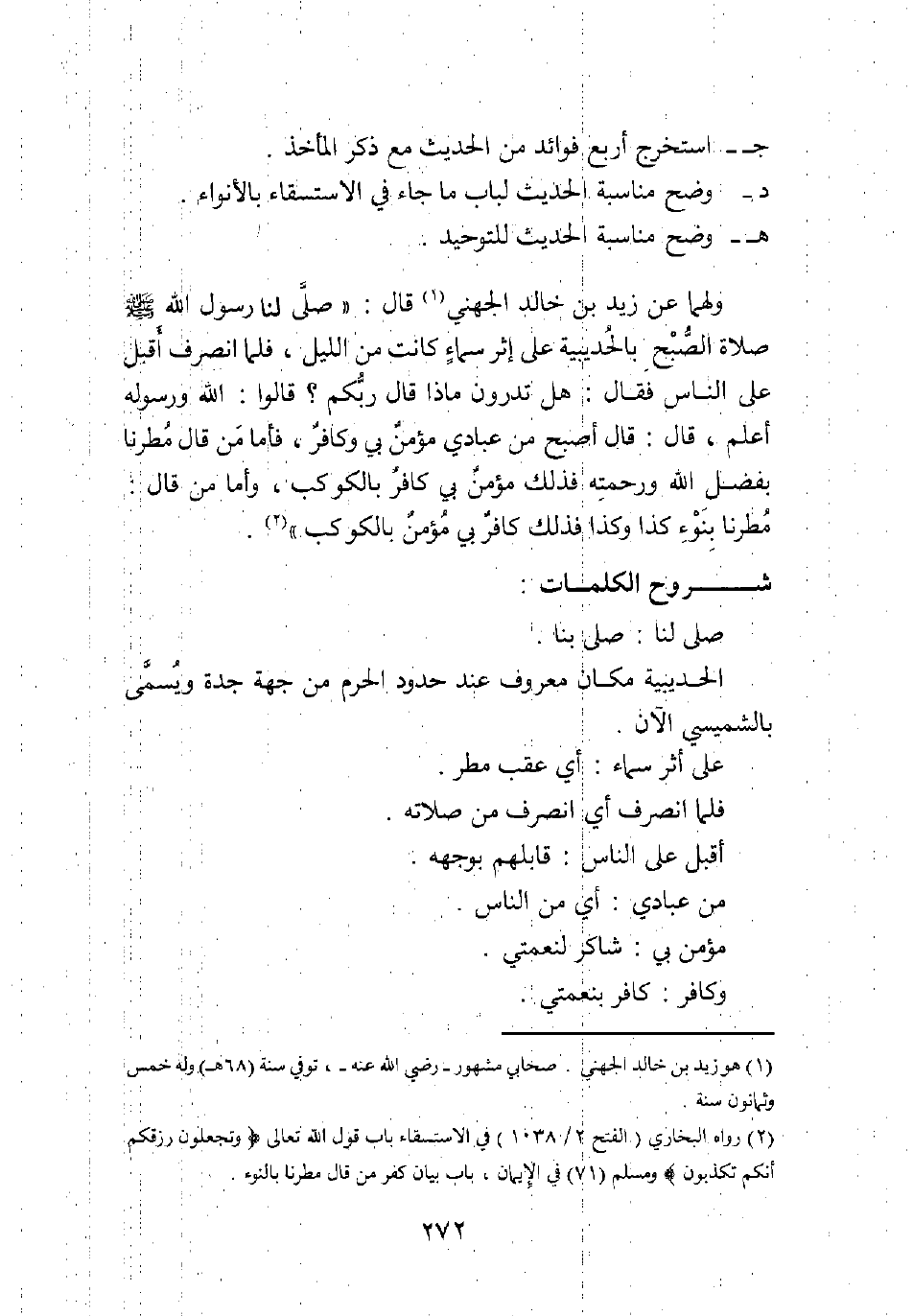 ولهما عن زيد بن خالد الجهني1 قال: "صلى لنا رسول الله صلى الله عليه وسلم صلاة الصبح بالحديبية على إثر سماء كانت من الليل، فلما انصرف أقبل على الناس فقال: هل تدرون ماذا قال ربكم؟ قالوا: الله ورسوله أعلم. قال: قال أصبح من عبادي مؤمن بي وكافر، فأما من قال: مطرنا بفضل الله ورحمته فذلك مؤمن بي كافر بالكوكب، وأما من قال: مطرنا بنوء كذا وكذا، فذلك كافر بي مؤمن بالكوكب"2.