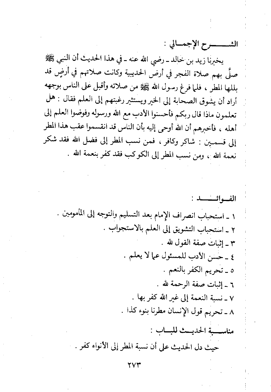 يخبرنا زيد بن خالد رضي الله عنه في هذا الحديث أن النبي صلى الله عليه وسلم صلى بهم صلاة الفجر في أرض الحديبية، وكانت صلاتهم في أرض قد بللها المطر، فلما فرغ رسول الله صلى الله عليه وسلم من صلاته وأقبل على الناس بوجهه أراد أن يشوق الصحابة إلى الخير، ويستثير رغبتهم إلى العلم فقال: هل تعلمون ماذا قال ربكم؟ فأحسنوا الأدب مع الله ورسوله وفوضوا العلم إلى أهله، فأخبرهم أن الله أوحى إليه بأن الناس قد انقسموا عقب هذا المطر إلى قسمين: شاكر وكافر، فمن نسب المطر إلى فضل الله فقد شكر نعمة الله، ومن نسب المطر إلى الكوكب فقد كفر بنعمة الله.