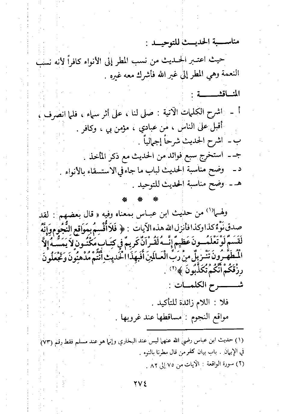 ولهما1 من حديث ابن عباس بمعناه وفيه: " قال بعضهم: لقد صدق نوء كذا وكذا "، فأنزل الله هذه الآيات: {فَلا أُقْسِمُ بِمَوَاقِعِ النُّجُومِ إِنَّهُ لَقُرْآنٌ كَرِيمٌ فِي كِتَابٍ مَكْنُون لا يَمَسُّهُ إِلاَّ الْمُطَهَّرُونَ تَنْزِيلٌ مِنْ رَبِّ الْعَالَمِينَ أَفَبِهَذَا الْحَدِيثِ أَنْتُمْ مُدْهِنُونَ وَتَجْعَلُونَ رِزْقَكُمْ أَنَّكُمْ تُكَذِّبُونَ} 2.