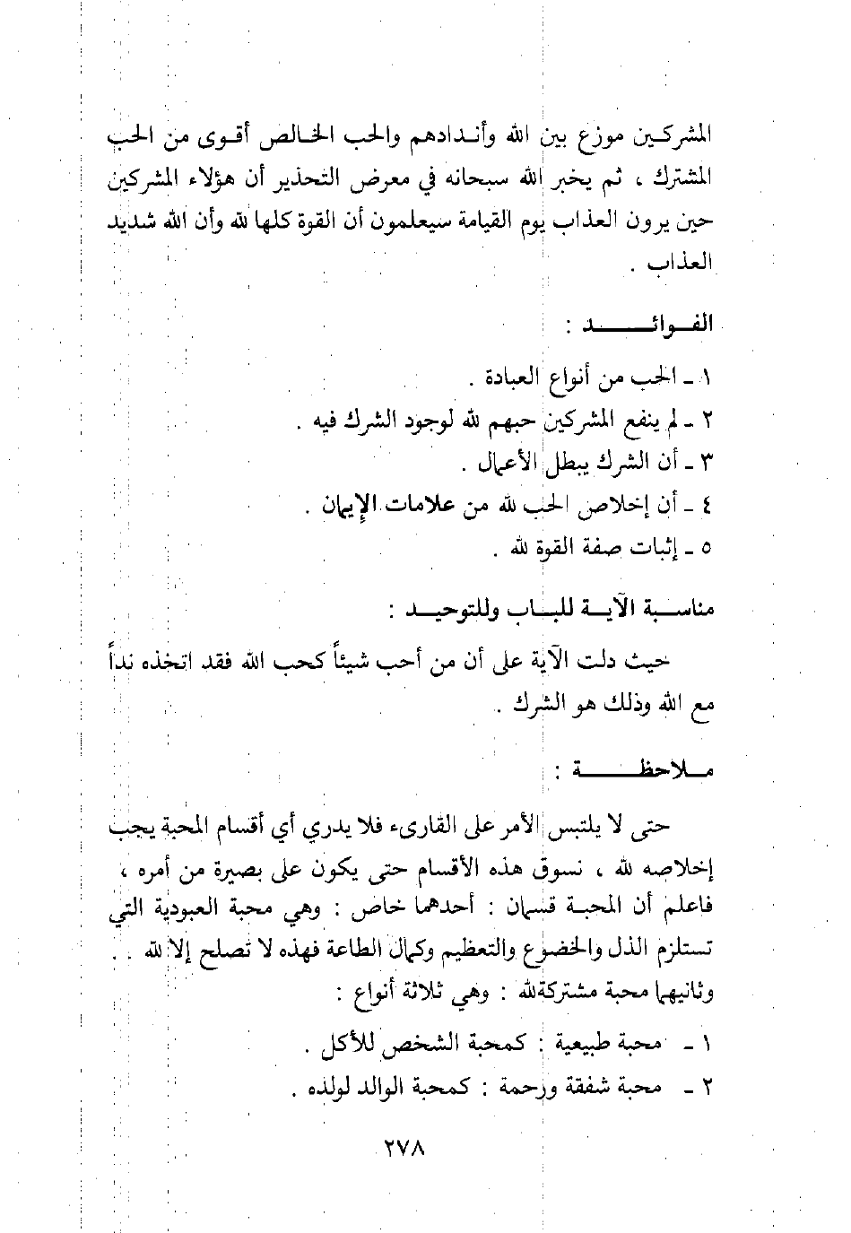 حتى لا يلتبس الأمر على القارئ فلا يدري أي أقسام المحبة يجب إخلاصه لله، نسوق هذه الأقسام حتى يكون على بصيرة من أمره. فاعلم أن المحبة قسمان: أحدهما خاص: وهي محبة العبودية التي تستلزم الذل والخضوع والتعظيم وكمال الطاعة، فهذه لا تصلح إلا لله. وثانيهما محبة مشتركة لله: وهي ثلاثة أنواع: