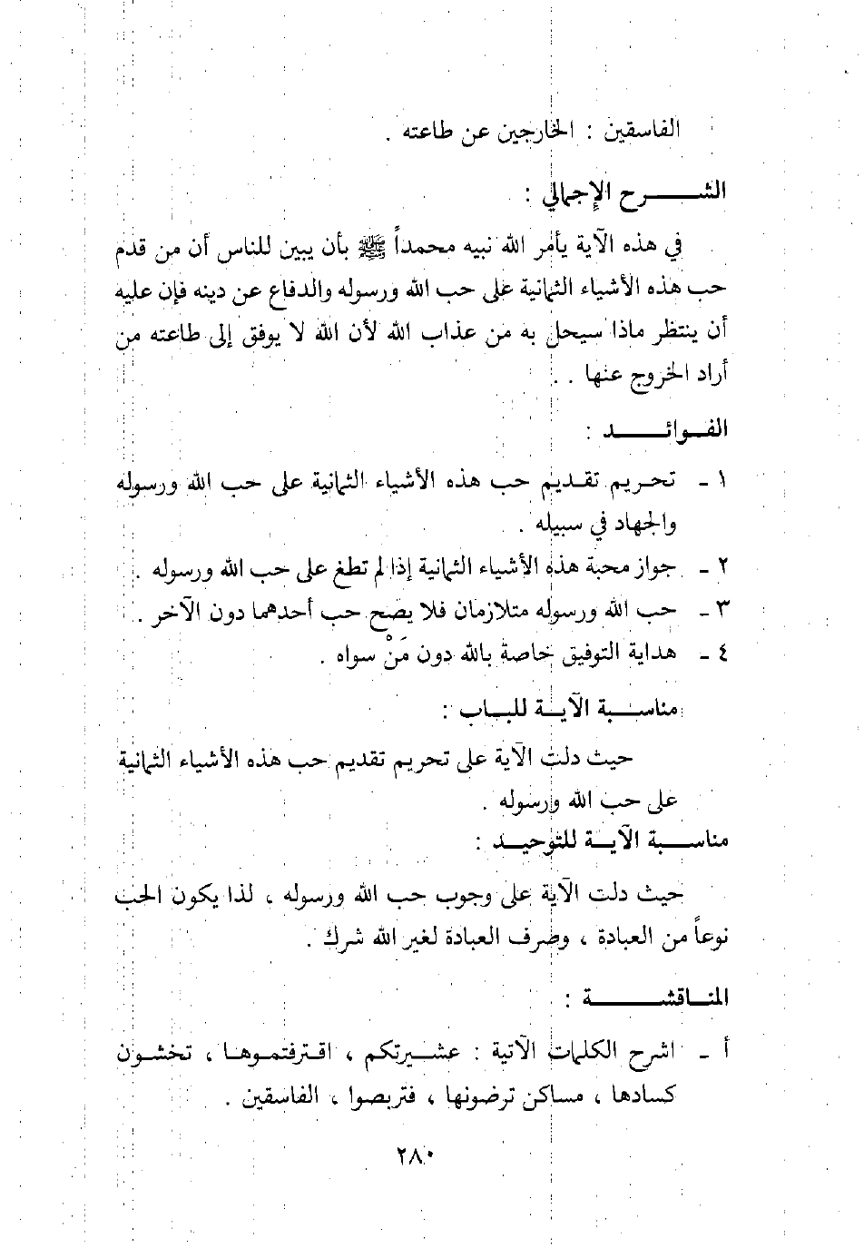 في هذه الآية يأمر الله نبيه محمدا صلى الله عليه وسلم بأن يبين للناس أن من قدم حب هذه الأشياء الثمانية على حب الله ورسوله والدفاع عن دينه، فإن عليه أن ينتظر ماذا سيحل به من عذاب الله؛ لأن الله لا يوفق إلى طاعته من أراد الخروج عنها.