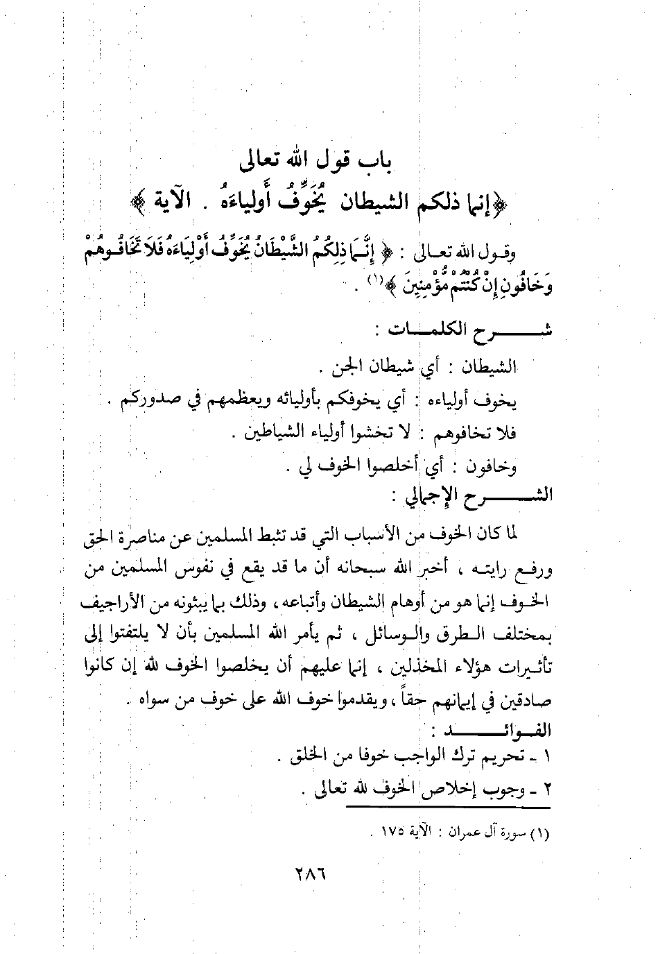 وقول الله تعالى: {إِنَّمَا ذَلِكُمُ الشَّيْطَانُ يُخَوِّفُ أَوْلِيَاءَهُ فَلا تَخَافُوهُمْ وَخَافُونِ إِنْ كُنْتُمْ مُؤْمِنِينَ} 1.