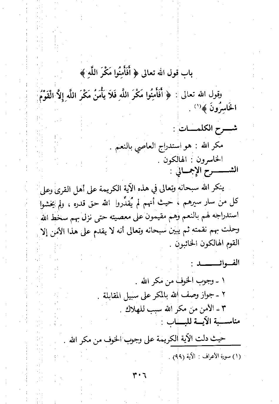 وقول الله تعالى: {أَفَأَمِنُوا مَكْرَ اللَّهِ فَلا يَأْمَنُ مَكْرَ اللَّهِ إِلاَّ الْقَوْمُ الْخَاسِرُونَ} 1.