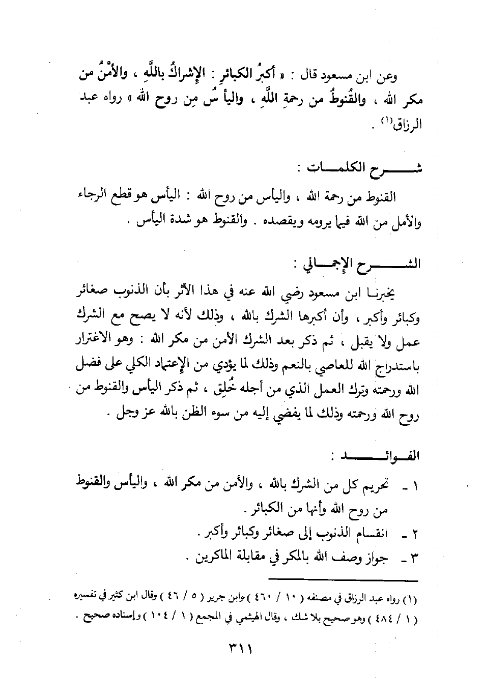 وعن ابن مسعود قال: " أكبر الكبائر: الإشراك بالله، والأمن من مكر الله، والقنوط من رحمة الله، واليأس من روح الله ". رواه عبد الرزاق1.