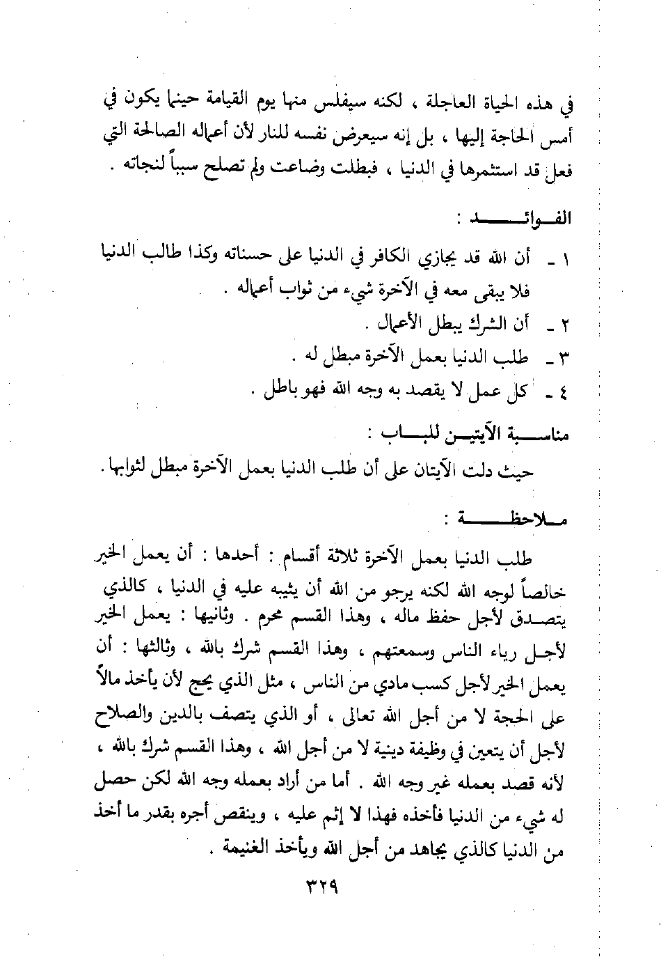 1. أن الله قد يجازي الكافر في الدنيا على حسناته وكذا طالب الدنيا، فلا يبقى معه في الآخرة شيء من ثواب أعماله.
