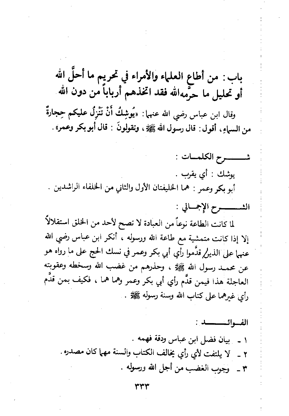 لما كانت الطاعة نوعا من العبادة لا تصح لأحد من الخلق استقلالا إلا إذا كانت متمشية مع طاعة الله ورسوله، أنكر ابن عباس - رضي الله عنهما - على الذين قدَّموا رأي أبي بكر وعمر في نسك الحج على ما رواه هو عن محمد رسول الله صلى الله عليه وسلم، وحذرهم من غضب الله وسخطه وعقوبته العاجلة، هذا فيمن قدَّم رأي أبي بكر وعمر وهما هما، فكيف بمن قدَّم رأي غيرهما على كتاب الله وسنة رسوله صلى الله عليه وسلم؟