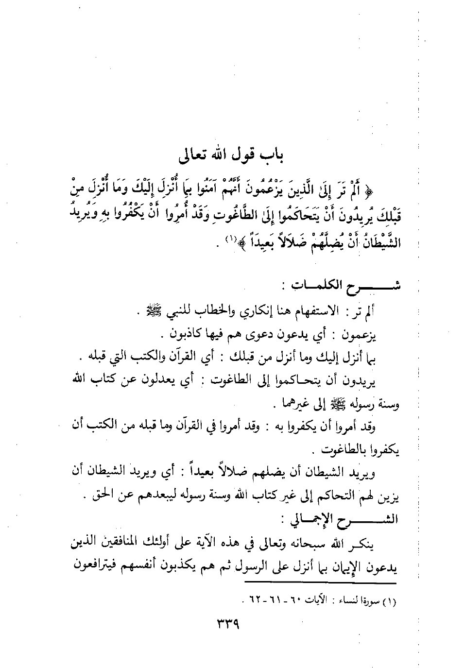 باب قول الله تعالى {أَلَمْ تَرَ إِلَى الَّذِينَ يَزْعُمُونَ أَنَّهُمْ آمَنُوا بِمَا أُنْزِلَ إِلَيْكَ وَمَا أُنْزِلَ مِنْ قَبْلِكَ يُرِيدُونَ أَنْ يَتَحَاكَمُوا إِلَى الطَّاغُوتِ وَقَدْ أُمِرُوا أَنْ يَكْفُرُوا بِهِ وَيُرِيدُ الشَّيْطَانُ أَنْ يُضِلَّهُمْ ضَلالاً بَعِيداً ?} 1.