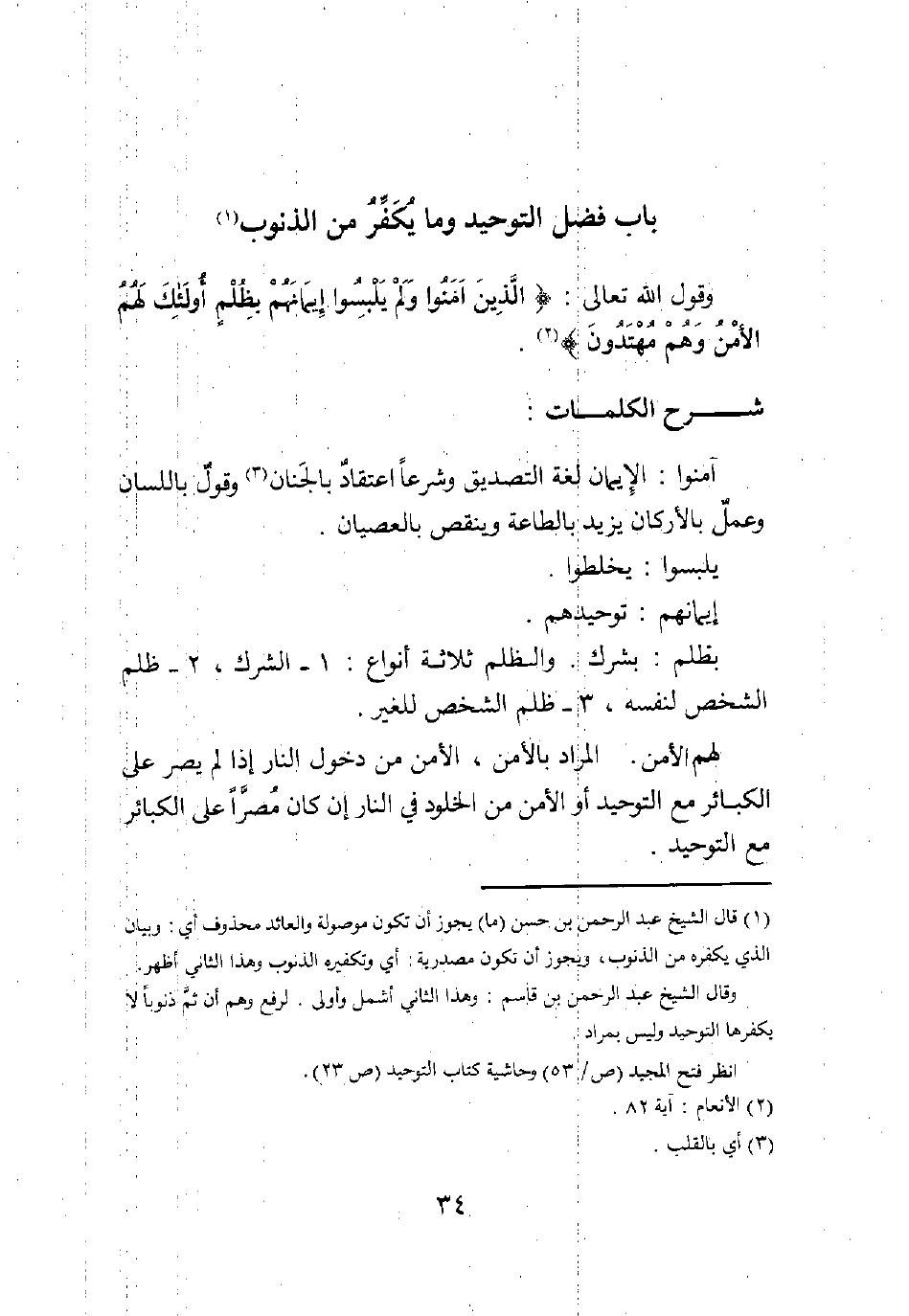 1 قال الشيخ عبد الرحمن بن حسن: (ما) يجوز أن تكون موصولة والعائد محذوف أي: وبيان الذي يكفره من الذنوب, ويجوز أن تكون مصدرية: أي وتكفيره الذنوب وهذا الثاني أظهر. وقال الشيخ عبد الرحمن بن قاسم: وهذا الثاني أشمل وأولى؛ لرفع وهم أن ثَمَّ ذنوبا لا يكفرها التوحيد، وليس بمراد. انظر: فتح المجيد (ص/ 53) ، وحاشية كتاب التوحيد (ص 23) .