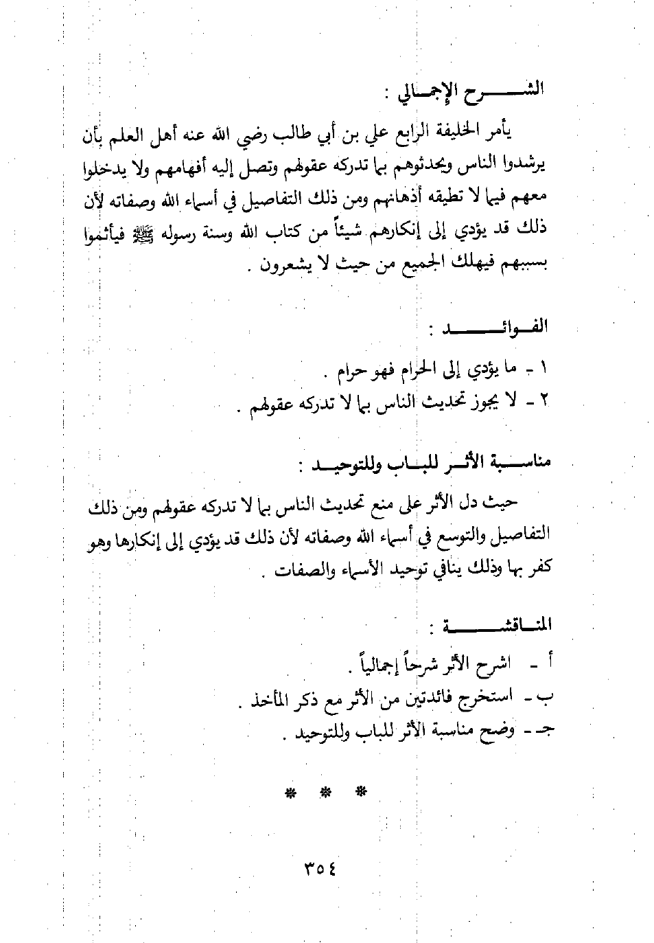 يأمر الخليفة الرابع علي بن أبي طالب رضي الله عنه أهل العلم بأن يرشدوا الناس ويحدثوهم بما تدركه عقولهم وتصل إليه أفهامهم، ولا يدخلوا معهم فيما لا تطيقه أذهانهم، ومن ذلك التفاصيل في أسماء الله وصفاته؛ لأن ذلك قد يؤدي إلى إنكارهم شيئا من كتاب الله وسنة رسوله صلى الله عليه وسلم فيأثموا بسببهم، فيهلك الجميع من حيث لا يشعرون.