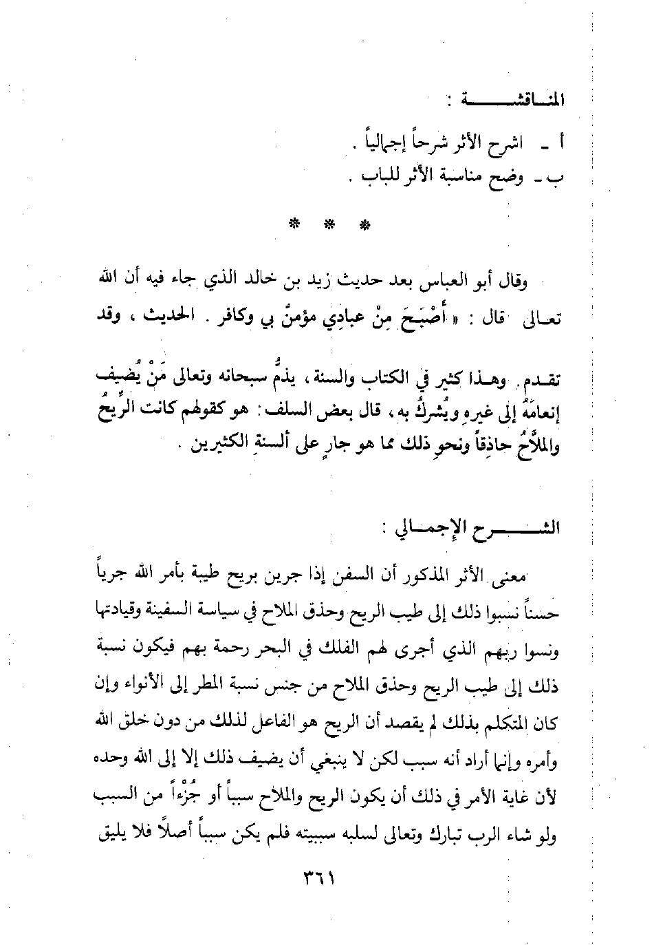 وقال أبو العباس - بعد حديث زيد بن خالد الذي جاء فيه أن الله تعالى قال: " أصبح من عبادي مؤمن بي وكافر "1 الحديث، وقد تقدم -: "وهذا كثير في الكتاب والسنة، يذم - سبحانه وتعالى - من يضيف إنعامه إلى غيره ويشرك به. قال بعض السلف: هو كقولهم كانت الريح والملاح حاذقا، ونحو ذلك مما هو جار على ألسنة الكثيرين".