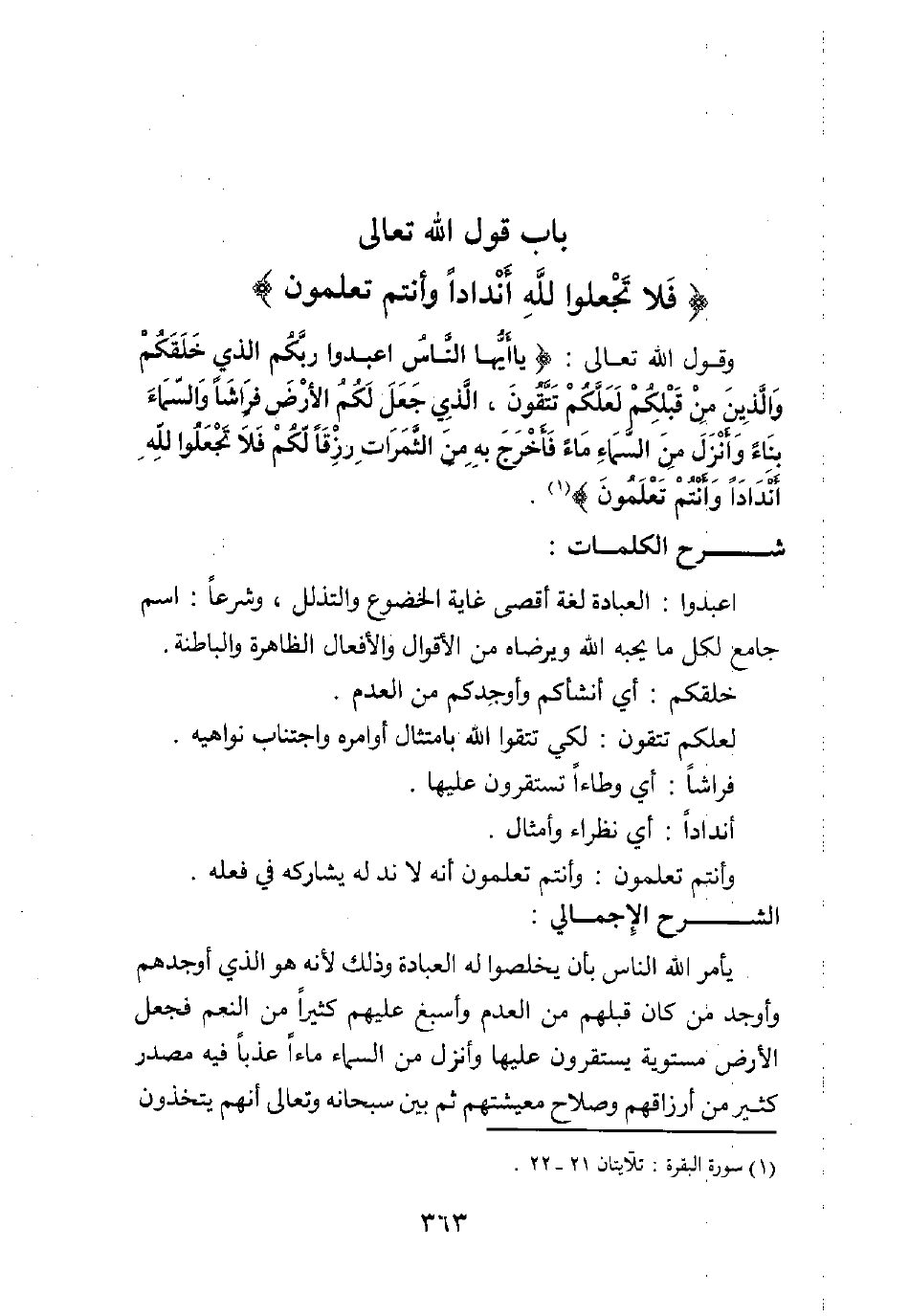 وقول الله تعالى: {يَا أَيُّهَا النَّاسُ اعْبُدُوا رَبَّكُمُ الَّذِي خَلَقَكُمْ وَالَّذِينَ مِنْ قَبْلِكُمْ لَعَلَّكُمْ تَتَّقُونَ الَّذِي جَعَلَ لَكُمُ الأَرْضَ فِرَاشاً وَالسَّمَاءَ بِنَاءً وَأَنْزَلَ مِنَ السَّمَاءِ مَاءً فَأَخْرَجَ بِهِ مِنَ الثَّمَرَاتِ رِزْقاً لَكُمْ فَلا تَجْعَلُوا لِلَّهِ أَنْدَاداً وَأَنْتُمْ تَعْلَمُونَ} 1.