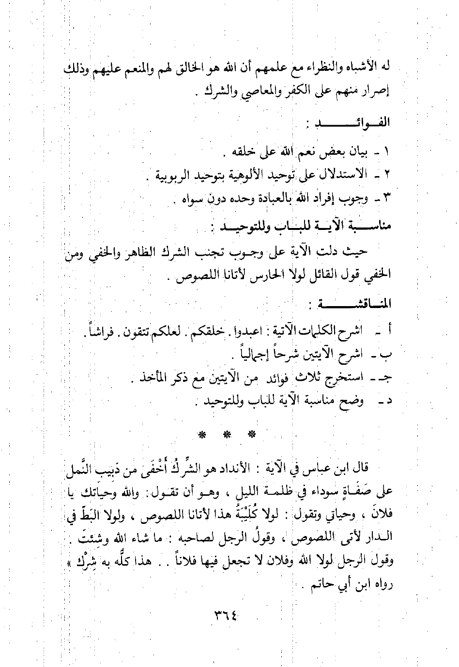 قال ابن عباس في الآية: " الأنداد: هو الشرك أخفى من دبيب النمل على صفاة سوداء في ظلمة الليل، وهو أن تقول: والله وحياتك يا فلان وحياتي، وتقول: لولا كليبة هذا لأتانا اللصوص، ولولا البط في الدار لأتى اللصوص. وقول الرجل لصاحبه: ما شاء الله وشئت. وقول الرجل: لولا الله وفلان، لا تجعل فيها فلانا.. هذا كله به شرك " رواه ابن أبي حاتم.