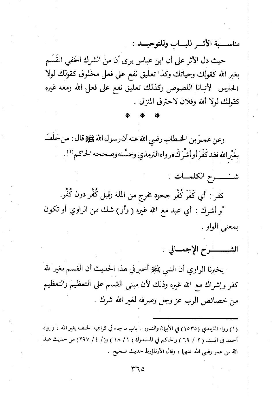 وعن عمر بن الخطاب رضي الله عنه أن رسول الله صلى الله عليه وسلم قال: " من حلف بغير الله فقد كفر أو أشرك " رواه الترمذي وحسنه وصححه الحاكم1.