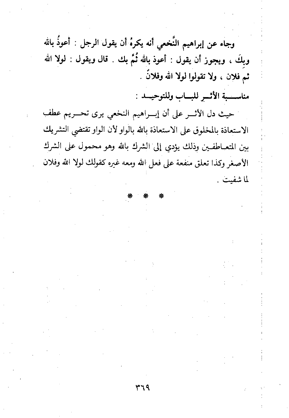 حيث دل الأثر على أن إبراهيم النخعي يرى تحريم عطف الاستعاذة بالمخلوق على الاستعاذة بالله بالواو؛ لأن (الواو) تقتضي التشريك بين المتعاطفي، ن وذلك يؤدي إلى الشرك بالله، وهو محمول على الشرك الأصغر وكذا تعلق منفعة على فعل الله ومعه غيره، كقولك: لولا الله وفلان لما شفيت.