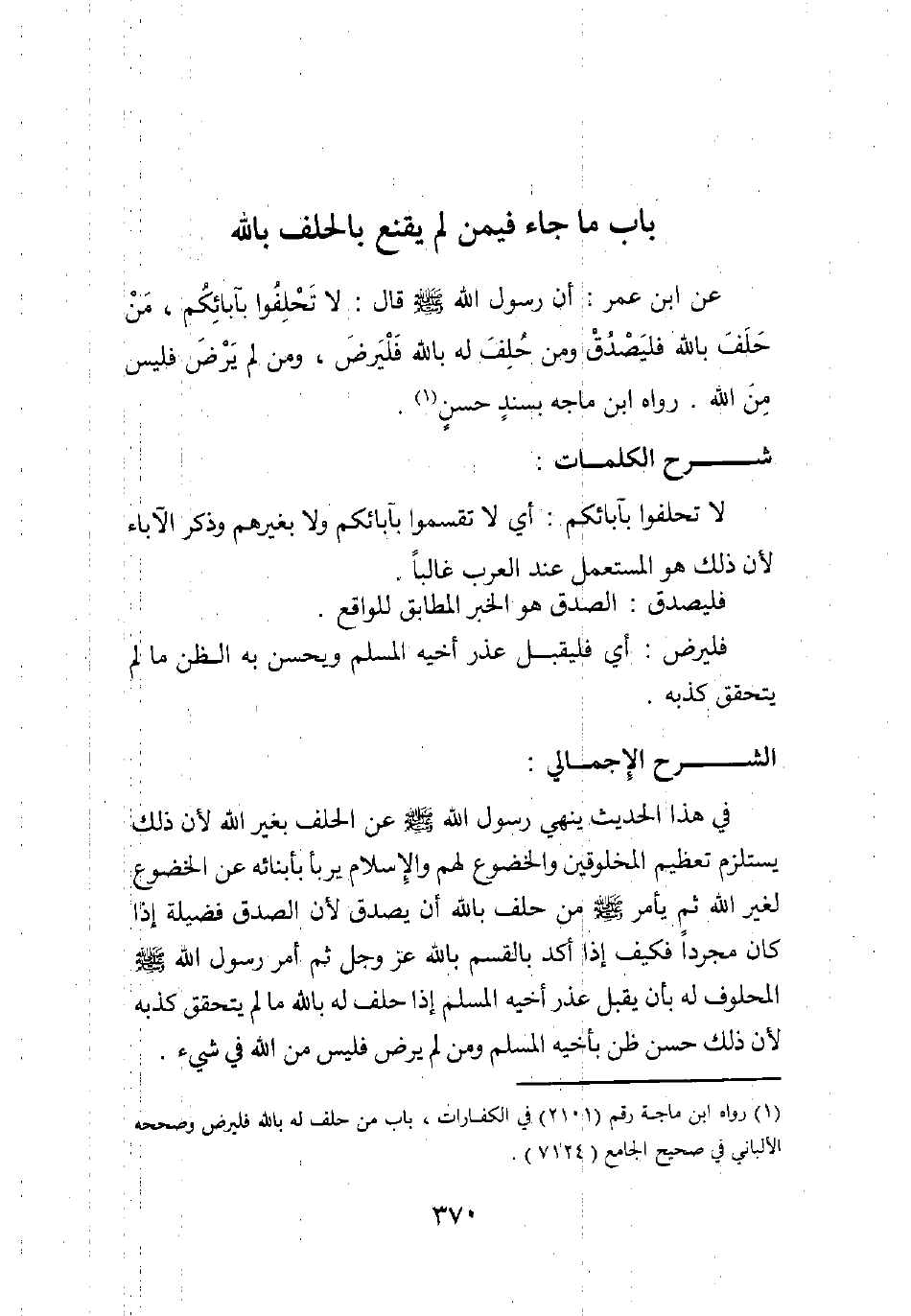 عن ابن عمر: أن رسول الله صلى الله عليه وسلم قال: " لا تحلفوا بآبائكم، من حلف بالله فليصدق، ومن حلف له بالله فليرض، ومن لم يرض فليس من الله " رواه ابن ماجه بسند حسن1.