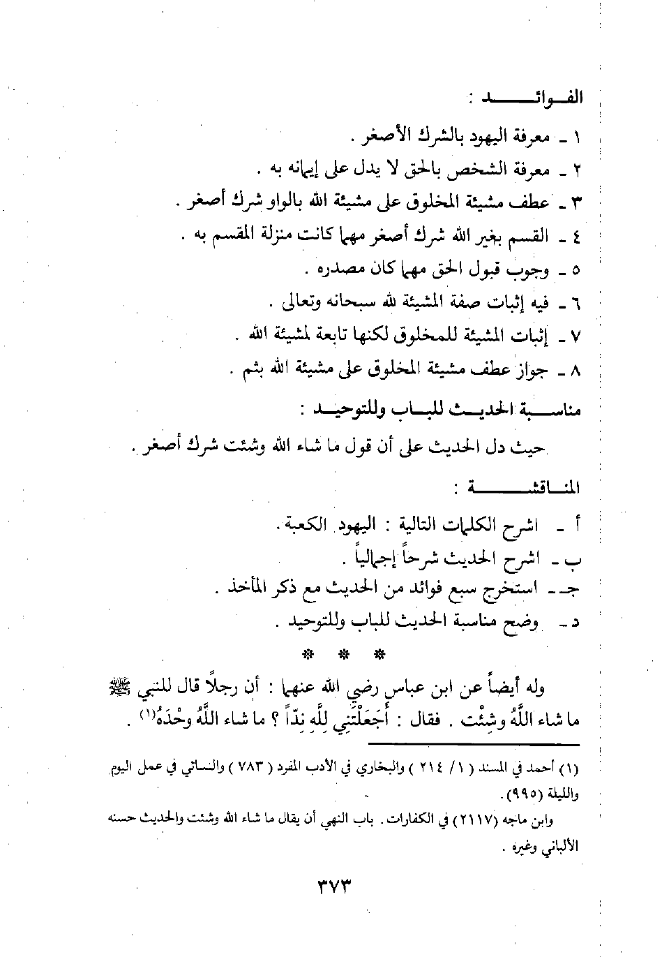 وله أيضا عن ابن عباس - رضي الله عنهما -: " أن رجلا قال للنبي صلى الله عليه وسلم: ما شاء الله وشئت. فقال: أجعلتني لله ندا؟ ما شاء الله وحده "1.