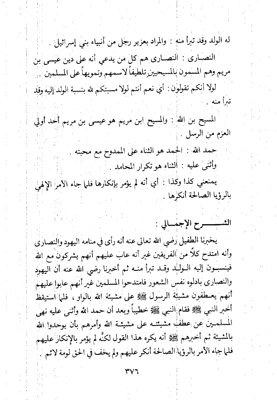 يخبرنا الطفيل - رضي الله تعالى عنه - أنه رأى في منامه اليهود والنصارى، وأنه امتدح كلا من الفريقين غير أنه عاب عليهم أنهم يشركون مع الله فينسبون إليه الولد، وقد تبرأ منه. ثم أخبرنا رضي الله عنه أن اليهود والنصارى بادلوه نفس الشعور، فامتدحوا المسلمين غير أنهم عابوا عليهم أنهم يعطفون مشيئة الرسول صلى الله عليه وسلم على مشيئة الله بالواو، فلما استيقظ أخبر النبي صلى الله عليه وسلم، فقام النبي صلى الله عليه وسلم خطيبا، وبعد أن حمد الله وأثنى عليه نهى المسلمين عن عطف مشيئته على مشيئة الله، وأمرهم بأن يوحدوا الله بالمشيئة، ثم أخبرهم صلى الله عليه وسلم أنه يكره هذا القول، لكنه لم يؤمر بالإنكار عليهم، فلما جاء الأمر بالرؤيا الصالحة أنكر عليهم ولم يخف في الحق لومة لائم.
