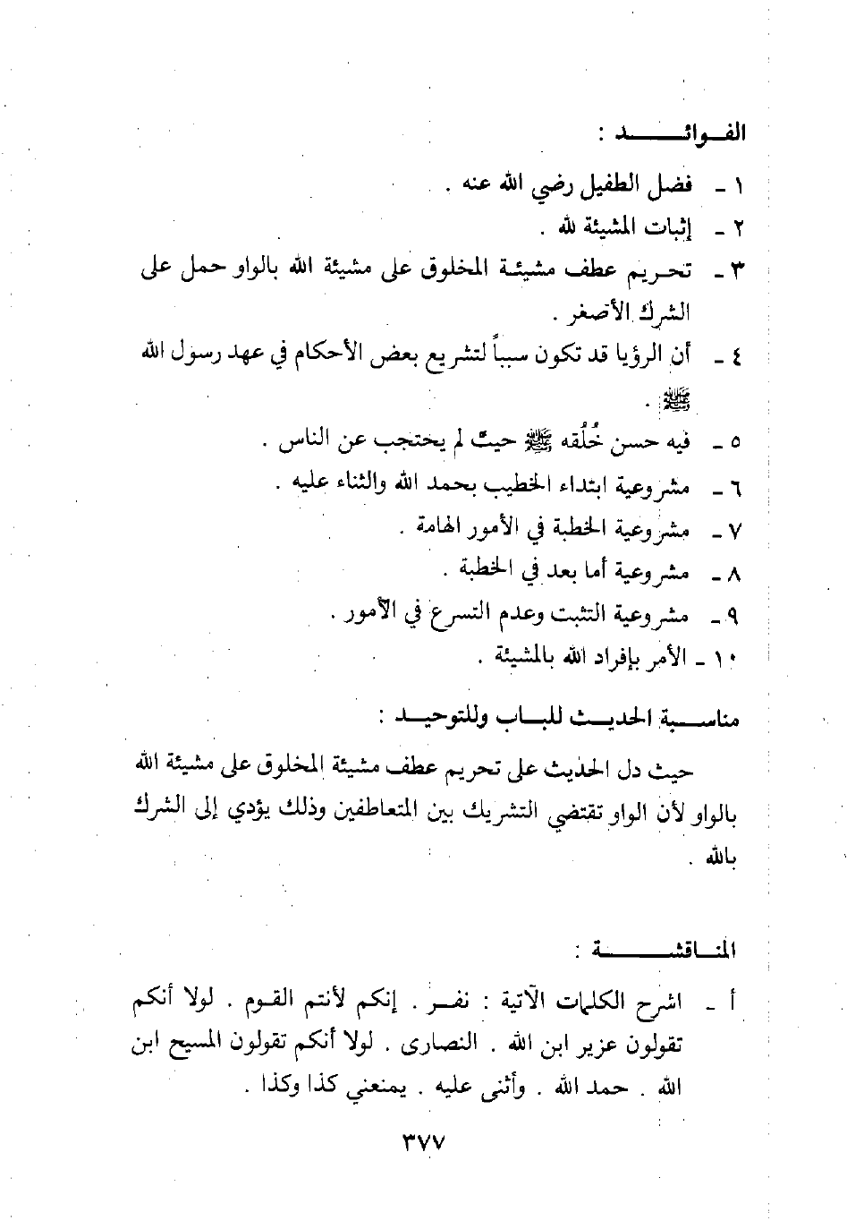 حيث دل الحديث على تحريم عطف مشيئة المخلوق على مشيئة الله بالواو؛ لأن الواو تقتضي التشريك بين المتعاطفين، وذلك يؤدي إلى الشرك بالله.
