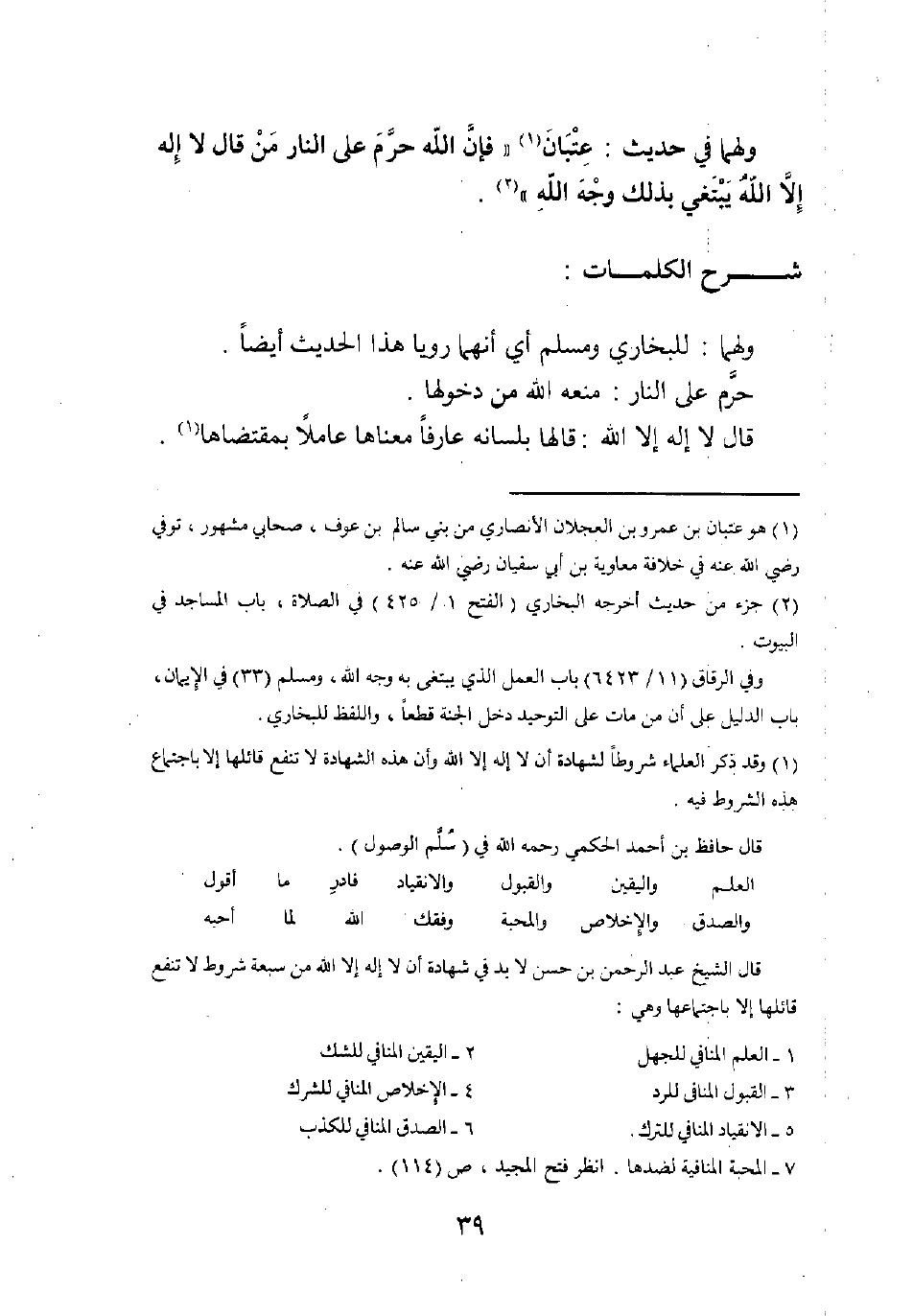 قال الشيخ عبد الرحمن بن حسن: لا بد في شهادة أن لا إله إلا الله من سبعة شروط لا تنفع قائلها إلا باجتماعها وهي: