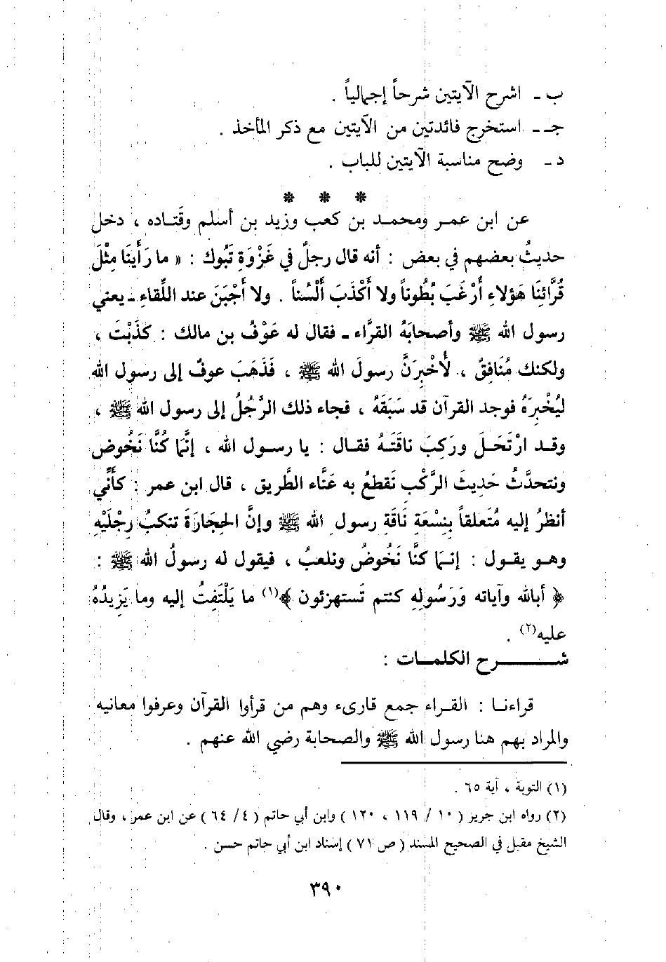 عن ابن عمر ومحمد بن كعب وزيد بن أسلم وقتادة، دخل حديث بعضهم في بعض: أنه قال رجل في غزوة تبوك: " ما رأينا مثل قرائنا هؤلاء أرغب بطونا، ولا أكذب ألسنا، ولا أجبن عند اللقاء- يعني رسول الله صلى الله عليه وسلم وأصحابه القراء-. فقال له عوف بن مالك: كذبت، ولكنك منافق، لأخبرن رسول الله صلى الله عليه وسلم. فذهب عوف إلى رسول الله ليخبره فوجد القرآن قد سبقه، فجاء ذلك الرجل إلى رسول الله صلى الله عليه وسلم وقد ارتحل، وركب ناقته فقال: يا رسول الله، إنما كنا نخوض ونتحدث حديث الركب نقطع به عناء الطريق، قال ابن عمر: كأني أنظر إليه متعلقا بنسعة ناقة رسول الله صلى الله عليه وسلم، وإن الحجارة تنكب رجليه وهو يقول: إنما كنا نخوض ونلعب، فيقول له رسول الله صلى الله عليه وسلم: {أَبِاللَّهِ وَآيَاتِهِ وَرَسُولِهِ كُنْتُمْ تَسْتَهْزِئُونَ} ما يلتفت إليه وما يزيده عليه"1.