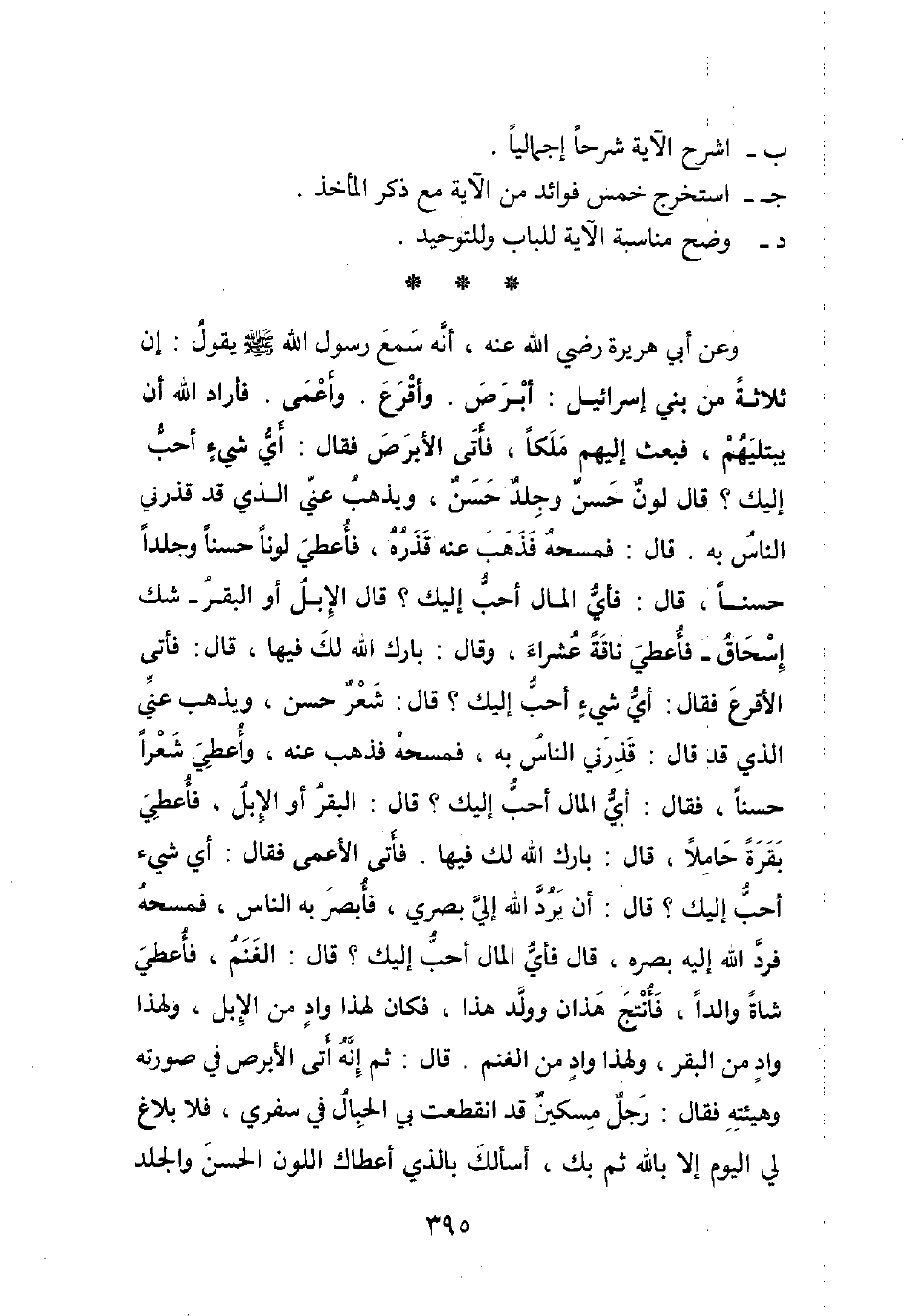 وعن أبي هريرة رضي الله عنه أنه سمع رسول الله صلى الله عليه وسلم يقول: " إن ثلاثة من بني إسرائيل: أبرص، وأقرع، وأعمى. فأراد الله أن يبتليهم، فبعث إليهم ملكا، فأتى الأبرص فقال: أي شيء أحب إليك؟ قال: لون حسن وجلد حسن، ويذهب عني الذي قد قذرني الناس به. قال: فمسحه فذهب عنه قذره، فأعطي لونا حسنا وجلدا حسنا، قال: فأي المال أحب إليك؟ قال: الإبل أو البقر- شك إسحاق- فأعطي ناقة عشراء، وقال: بارك الله لك فيها، قال: فأتى الأقرع فقال: أي شيء أحب إليك؟ قال: شعر حسن، ويذهب عني الذي قد قذرني الناس به، فمسحه فذهب عنه، وأعطي شعرا حسنا، فقال: أي المال أحب إليك؟ قال: البقر أو الإبل، فأعطي بقرة حاملا، قال: بارك الله لك فيها. فأتى الأعمى فقال: أي شيء أحب إليك؟ قال: أن يرد الله إلي بصري، فأبصر به الناس، فمسحه فرد الله إليه بصره، قال: فأي المال أحب إليك؟ قال: الغنم، فأعطي شاة والدا، فأنتج هذان وولد هذا، فكان لهذا واد من الإبل، ولهذا واد من البقر، ولهذا واد من الغنم. قال: ثم إنه أتى الأبرص في صورته وهيئته فقال: رجل مسكين قد انقطعت بي الحبال في سفري، فلا بلاغ لي اليوم إلا بالله ثم بك، أسألك بالذي أعطاك اللون الحسن والجلد