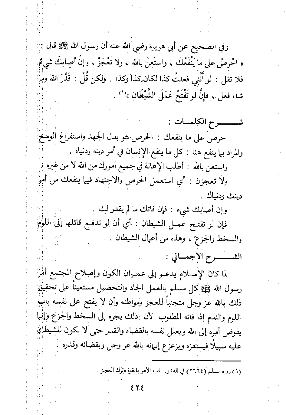 لما كان الإسلام يدعو إلى عمران الكون وإصلاح المجتمع، أمر رسول الله صلى الله عليه وسلم كل مسلم بالعمل الجاد والتحصيل مستعينا على تحقيق ذلك بالله عزوجل، متجنبا للعجز ومواطنه، وأن لا يفتح على نفسه باب اللوم والندم إذا فاته المطلوب؛ لأن ذلك يجره إلى السخط والجزع، وإنما يفوض أمره إلى الله ويعلل نفسه بالقضاء والقدر حتى لا يكون للشيطان عليه سبيل، فيستفزه ويزعزع إيمانه بالله عزوجل وبقضائه وقدره.