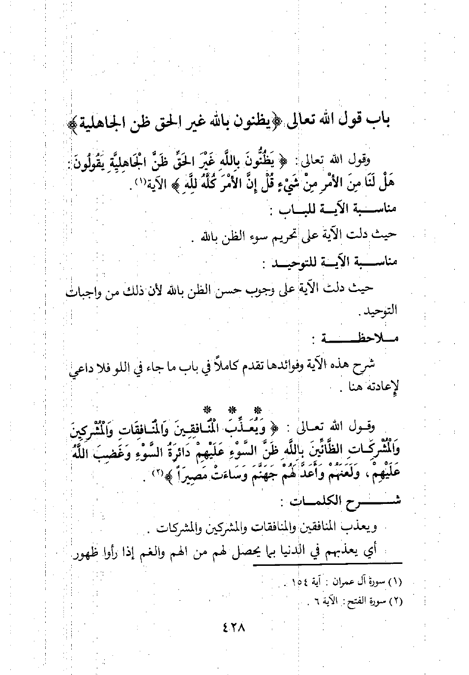 وقول الله تعالى: {وَيُعَذِّبَ الْمُنَافِقِينَ وَالْمُنَافِقَاتِ وَالْمُشْرِكِينَ وَالْمُشْرِكَاتِ الظَّانِّينَ بِاللَّهِ ظَنَّ السَّوْءِ عَلَيْهِمْ دَائِرَةُ السَّوْءِ وَغَضِبَ اللَّهُ عَلَيْهِمْ وَلَعَنَهُمْ وَأَعَدَّ لَهُمْ جَهَنَّمَ وَسَاءَتْ مَصِيراً} 2.