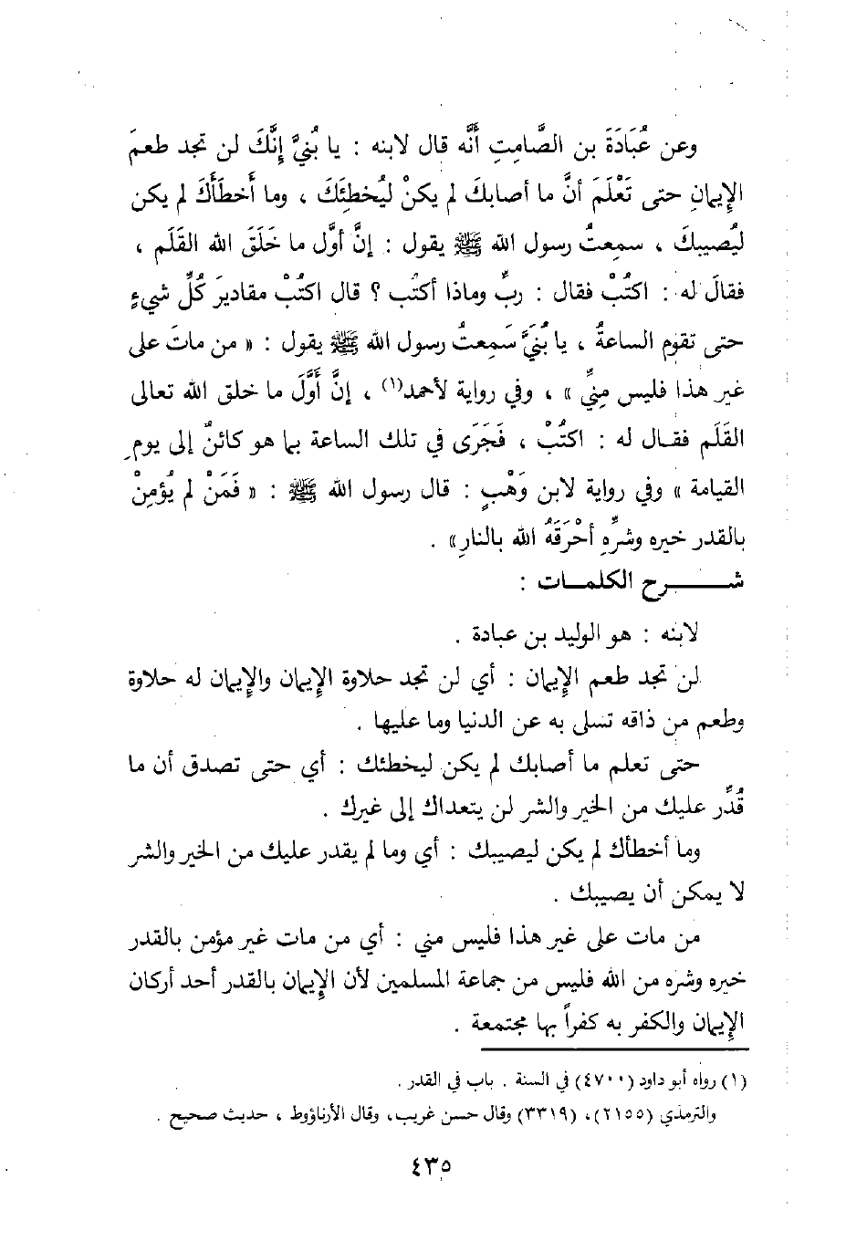 وعن عبادة بن الصامت أنه قال لابنه: " يا بني إنك لن تجد طعم الإيمان حتى تعلم أن ما أصابك لم يكن ليخطئك، وما أخطأك لم يكن ليصيبك، سمعت رسول الله صلى الله عليه وسلم يقول: إن أول ما خلق الله القلم، فقال له: اكتب، فقال: رب وماذا أكتب؟ قال: اكتب مقادير كل شيء حتى تقوم الساعة، يا بني سمعت رسول الله صلى الله عليه وسلم يقول: من مات على غير هذا فليس مني ". وفي رواية لأحمد: 1 " إن أول ما خلق الله تعالى القلم فقال له: اكتب، فجرى في تلك الساعة بما هو كائن إلى يوم القيادة "2. وفي رواية لابن وهب: قال رسول الله صلى الله عليه وسلم: " فمن لم يؤمن بالقدر خيره وشره أحرقه الله بالنار "3.