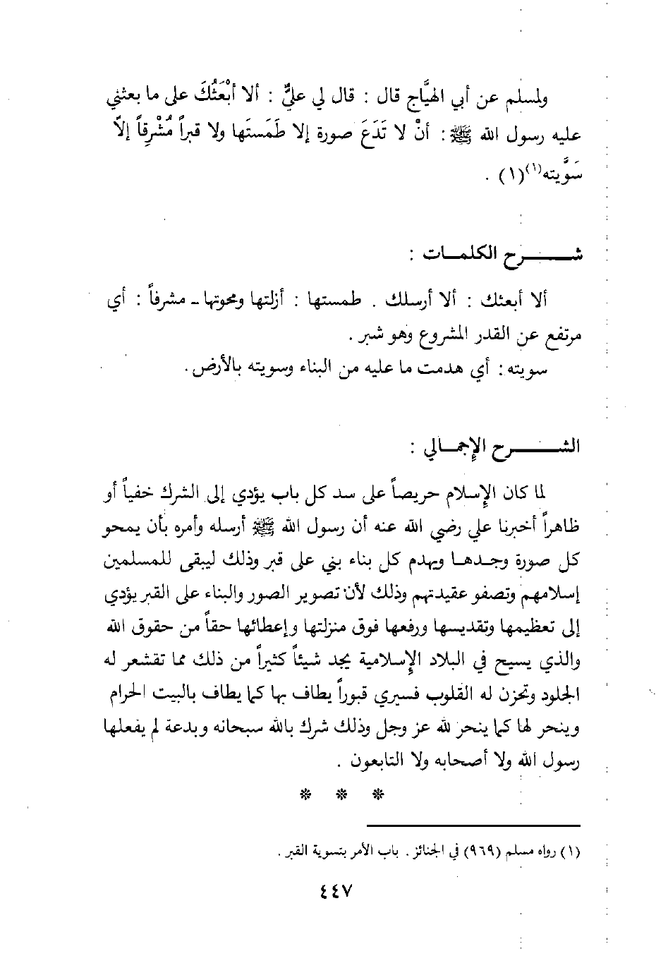 ولمسلم عن أبي الهياج قال: قال لي علي: " ألا أبعثك على ما بعثني عليه رسول الله صلى الله عليه وسلم: أن لا تدع صورة إلا طمستها، ولا قبرا مشرفا إلا سويته"1.