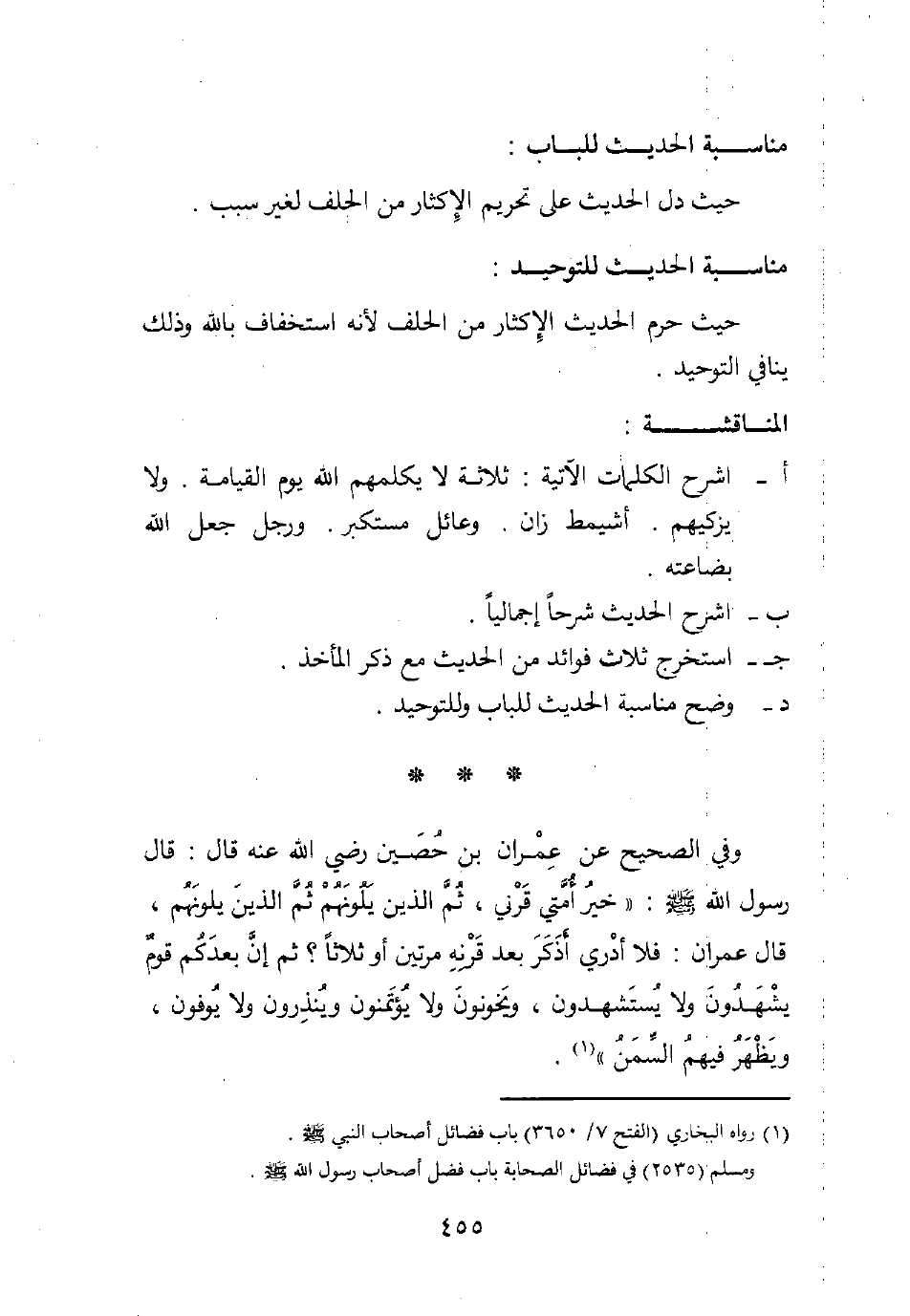 وفي الصحيح عن عمران بن حصين رضي الله عنه قال: قال رسول الله صلى الله عليه وسلم: " خير أمتي قرني، ثم الذين يلونهم، ثم الذين يلونهم، -قال عمران: فلا أدري أذكر بعد قرنه مرتين أو ثلاثا؟ - ثم إن بعدكم قوما يشهدون ولا يستشهدون، ويخونون ولا يؤتمنون، وينذرون ولا يوفون، ويظهر فيهم السمن"1.