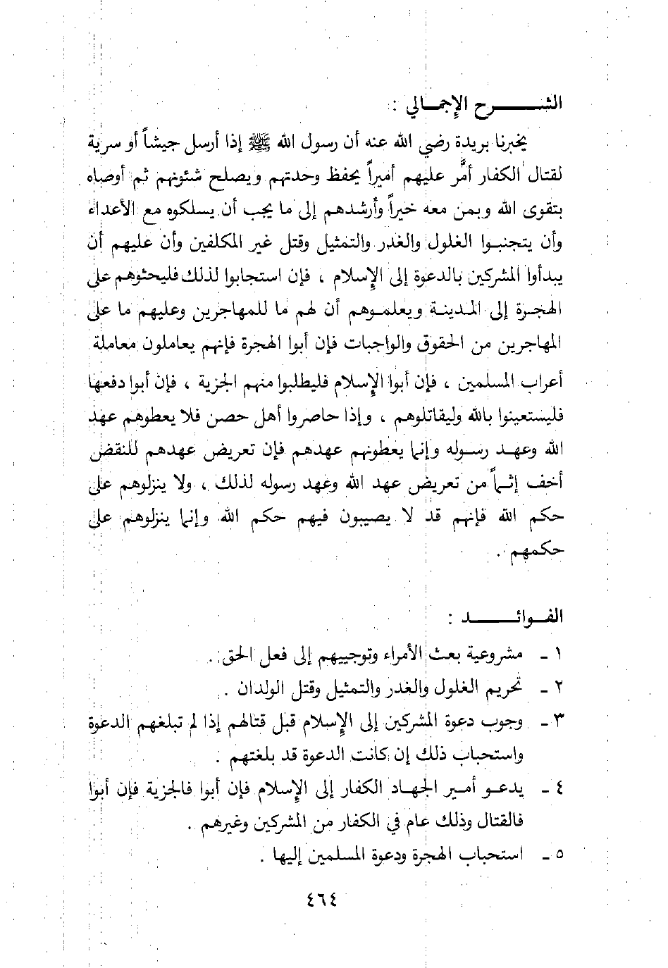 يخبرنا بريدة رضي الله عنه أن رسول الله صلى الله عليه وسلم إذا أرسل جيشا أو سرية لقتال الكفار أمر عليهم أميرا يحفظ وحدتهم ويصلح شئونهم، ثم أوصاه بتقوى الله وبمن معه خيرا، وأرشدهم إلى ما يجب أن يسلكوه مع الأعداء، وأن يتجنبوا الغلول والغدر والتمثيل وقتل غير المكلفين، وأن عليهم أن يبدءوا المشركين بالدعوة إلى الإسلام، فإن استجابوا لذلك فليحثوهم على الهجرة إلى المدينة ويعلموهم أن لهم ما للمهاجرين وعليهم ما على المهاجرين من الحقوق والواجبات، فإن أبوا الهجرة فإنهم يعاملون معاملة أعراب المسلمين، فإن أبوا الإسلام فليطلبوا منهم الجزية، فإن أبوا دفعها فليستعينوا بالله وليقاتلوهم، وإذا حاصروا أهل حصن فلا يعطوهم عهد الله وعهد رسوله، وإنما يعطونهم عهدهم، فإن تعريض عهدهم للنقض أخف إثما من تعريض عهد الله وعهد رسوله لذلك، ولا ينزلوهم على حكم الله، فإنهم قد لا يصيبون فيهم حكم الله وإنما ينزلوهم على حكمهم.
