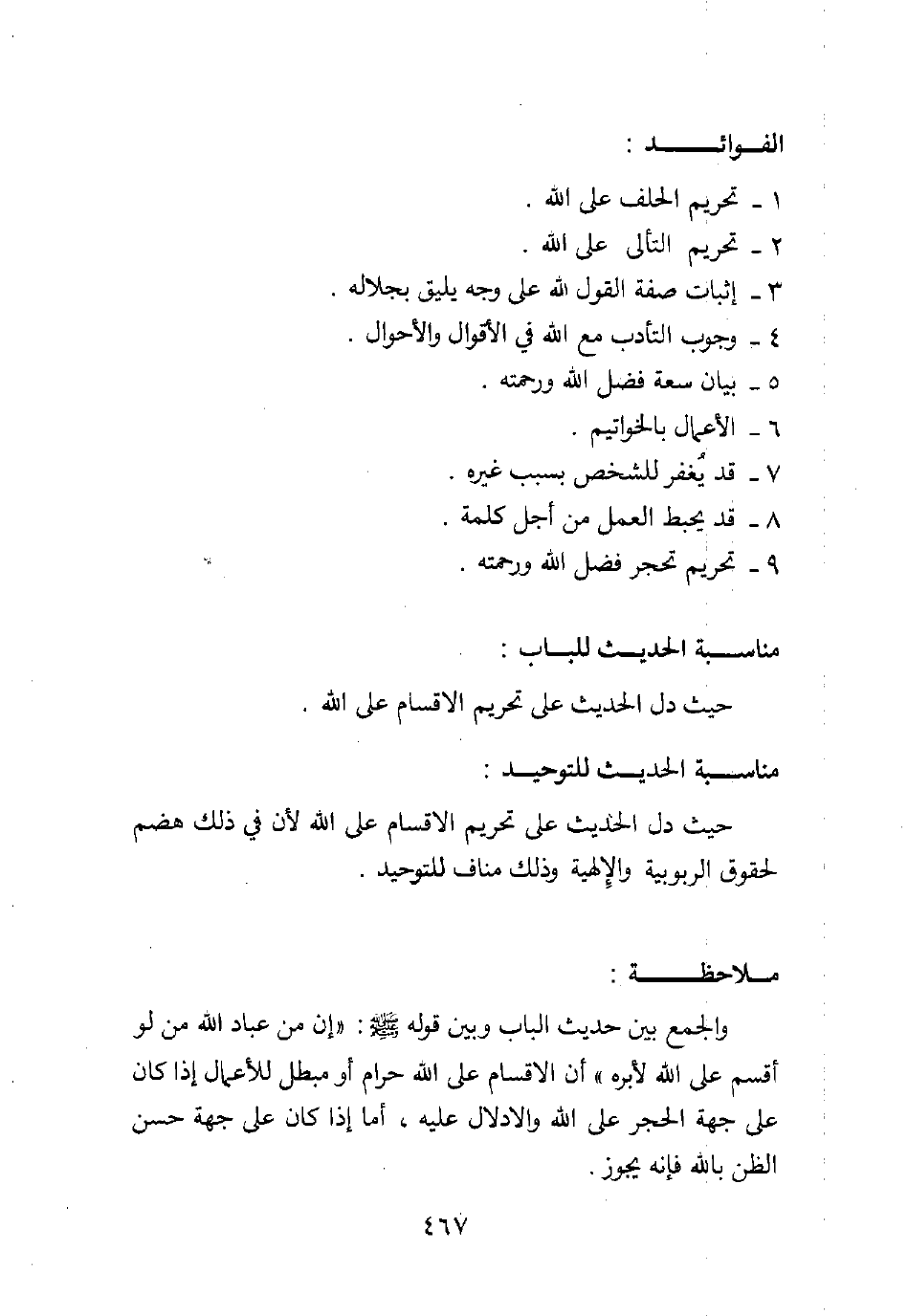 مناسبة الحديث للتوحيد: حيث دل الحديث على تحريم الإقسام على الله؛ لأن في ذلك هضما لحقوق الربوبية والإلهية وذلك مناف للتوحيد.