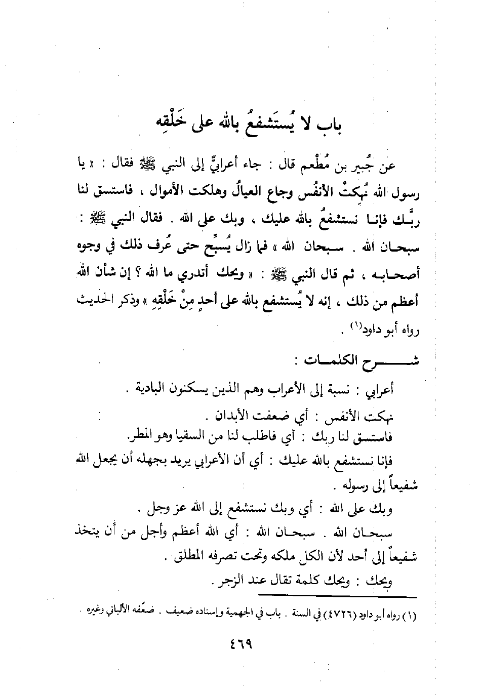 عن جبير بن مطعم قال: " جاء أعرابي إلى النبي صلى الله عليه وسلم فقال: يا رسول الله نهكت الأنفس وجاع العيال وهلكت الأموال، فاستسق لنا ربك، فإنا نستشفع بالله عليك، وبك عن الله. فقال النبي صلى الله عليه وسلم: سبحان الله! سبحان الله! فما زال يسبح حتى عرف ذلك في وجوه أصحابه، ثم قال النبي صلى الله عليه وسلم: ويحك أتدري ما الله؟ إن شأن الله أعظم من ذلك، إنه لا يستشفع بالله على أحد من خلقه " وذكر الحديث. رواه أبو داود1.